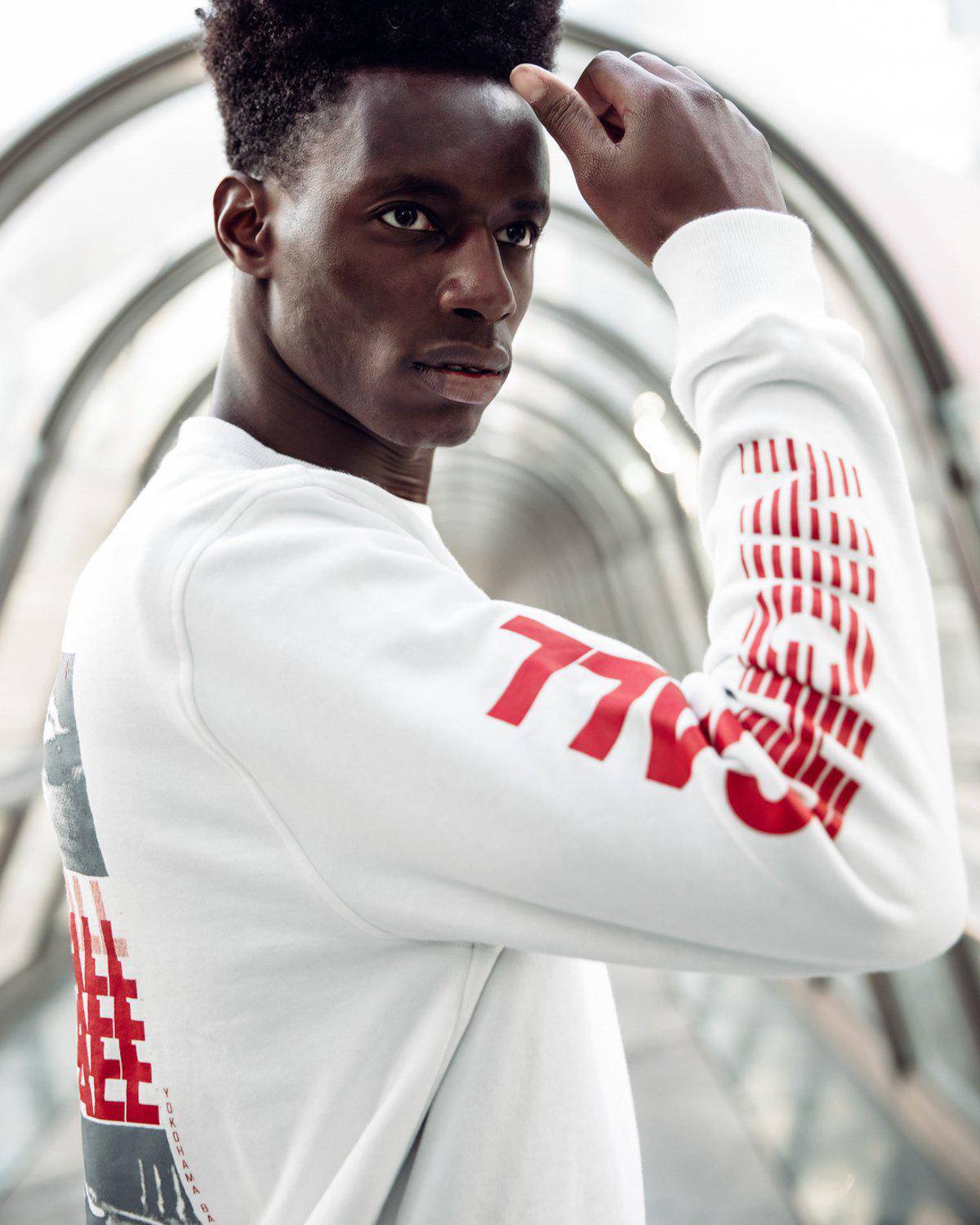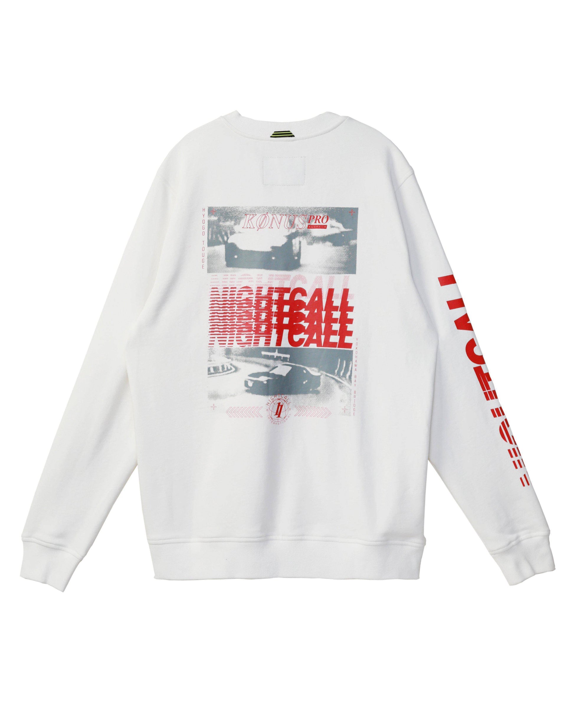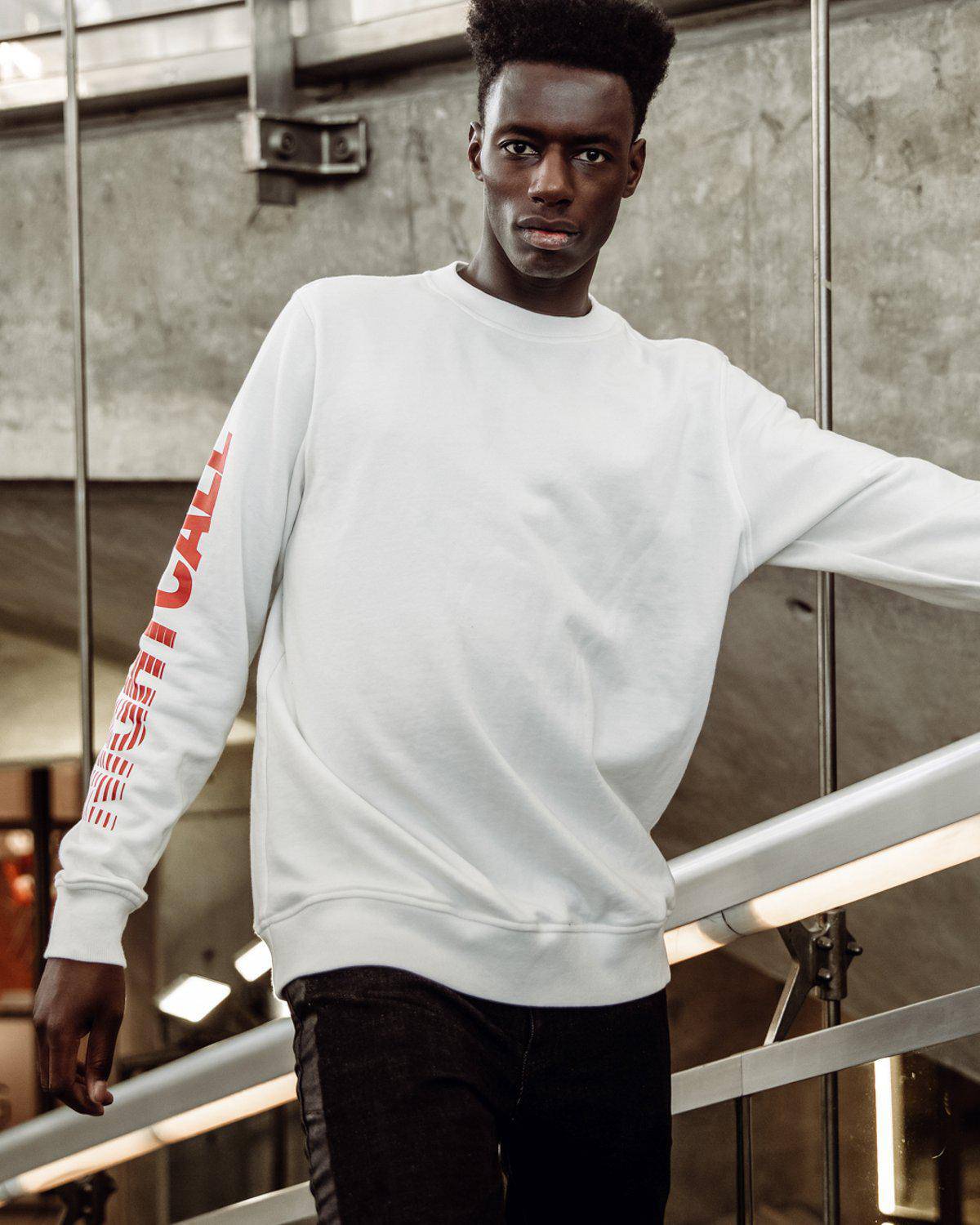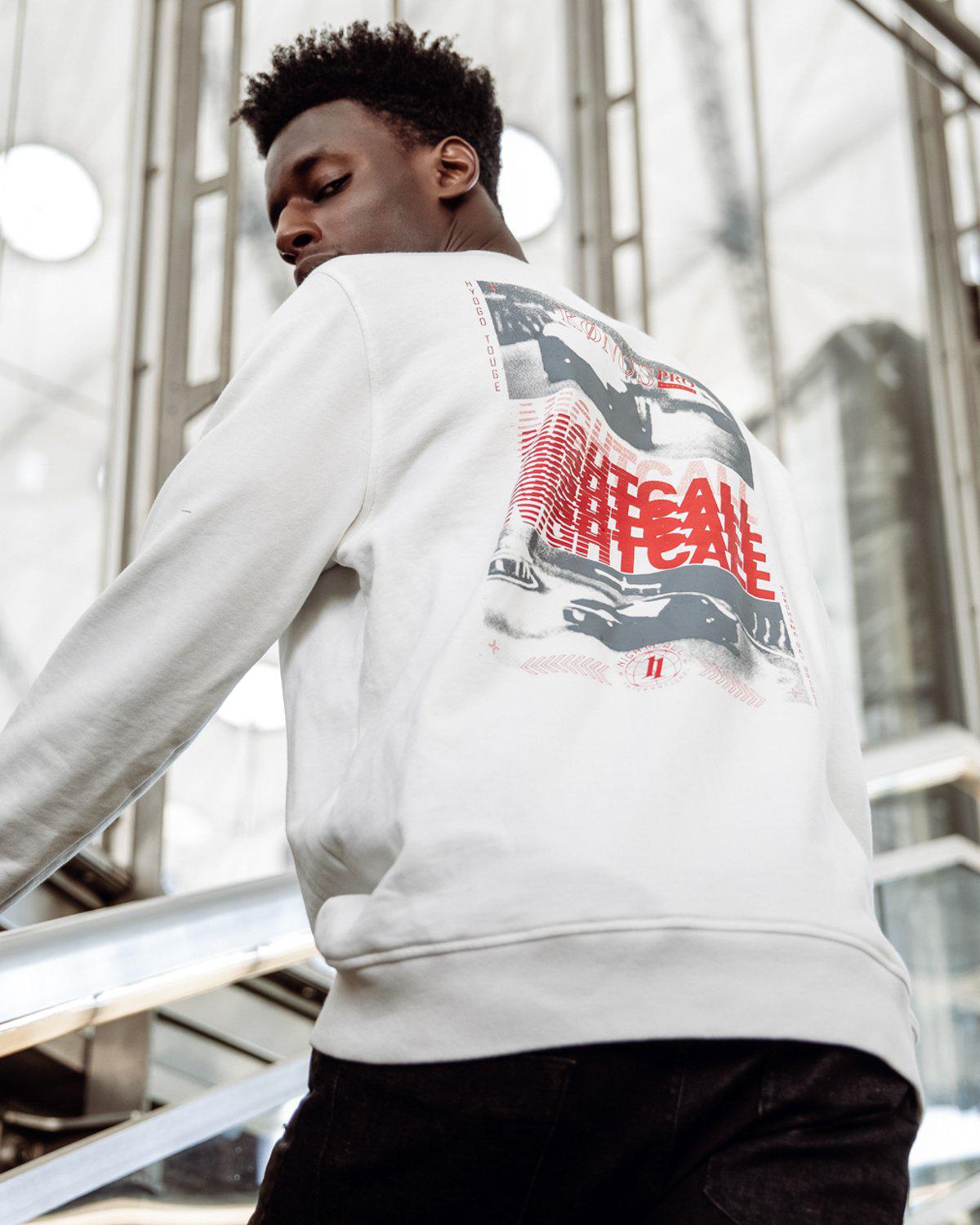 French terry sweatshirt with screen print on back and wearer's right sleeve
