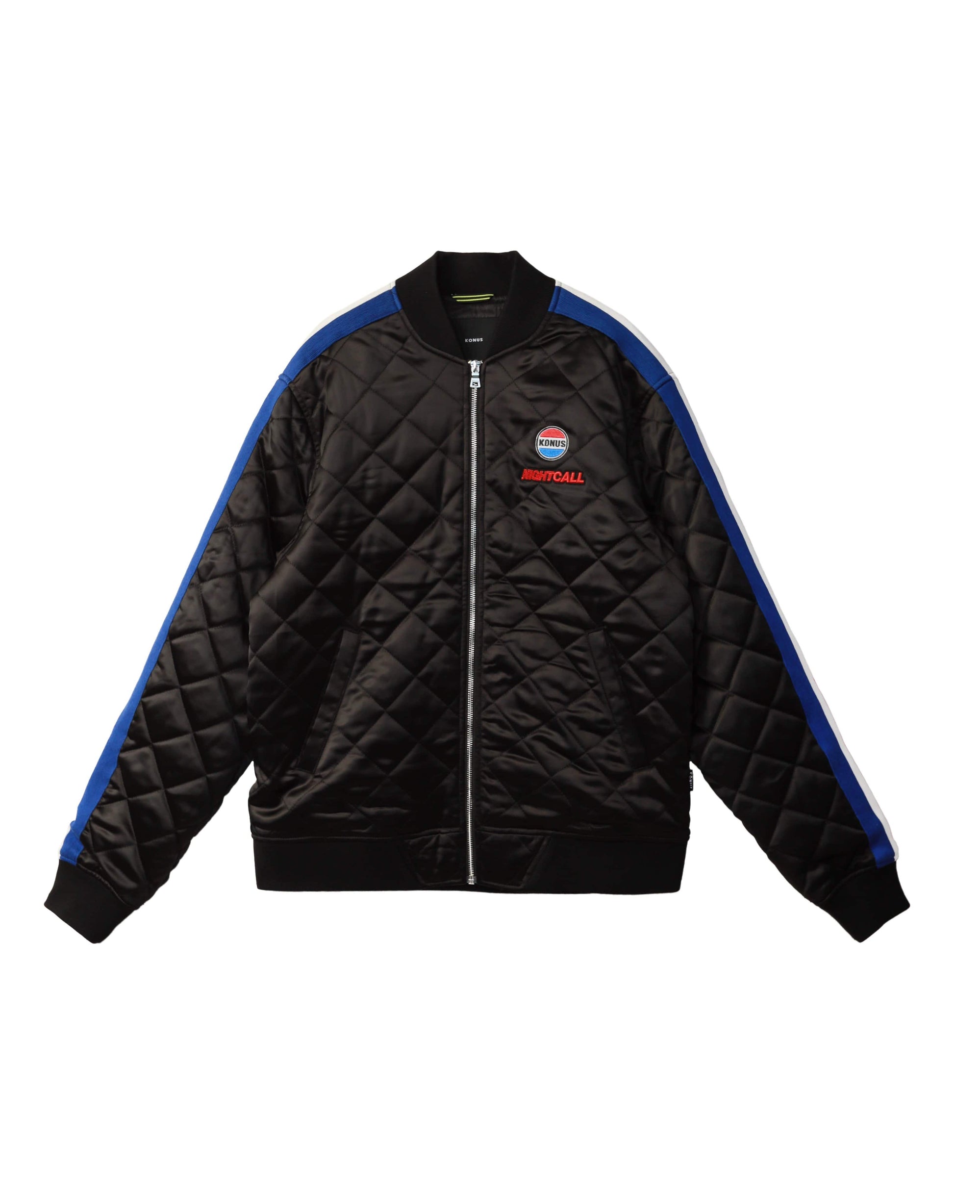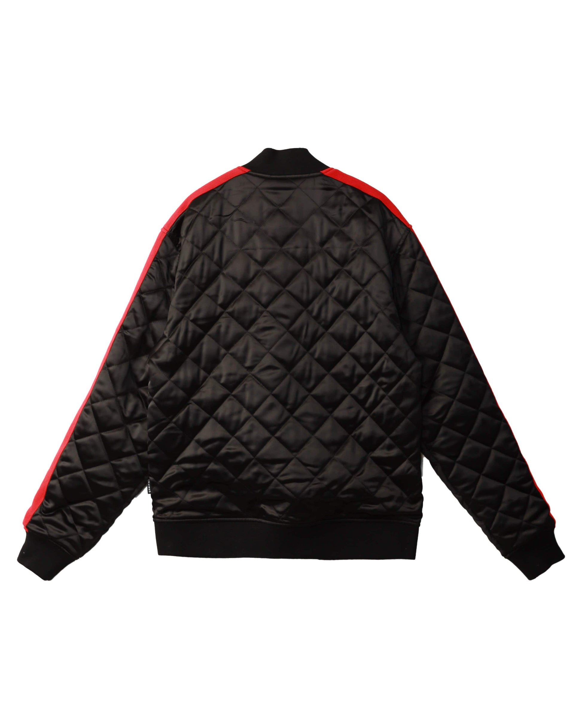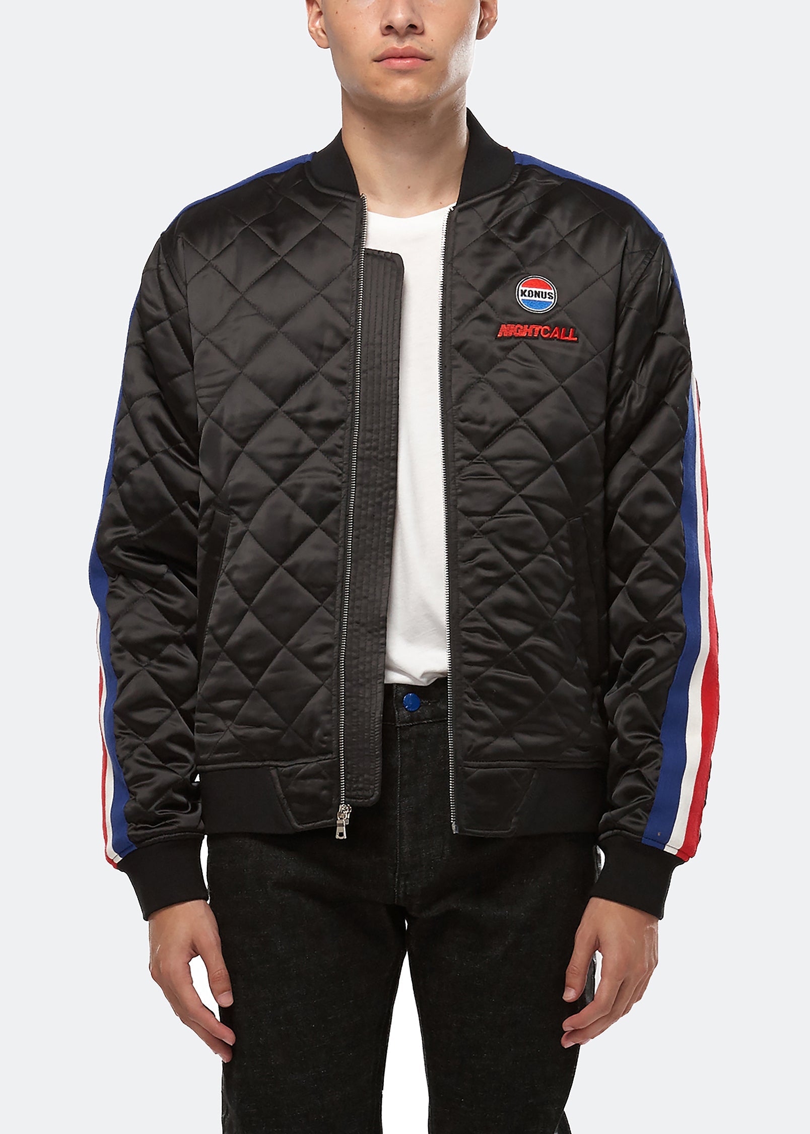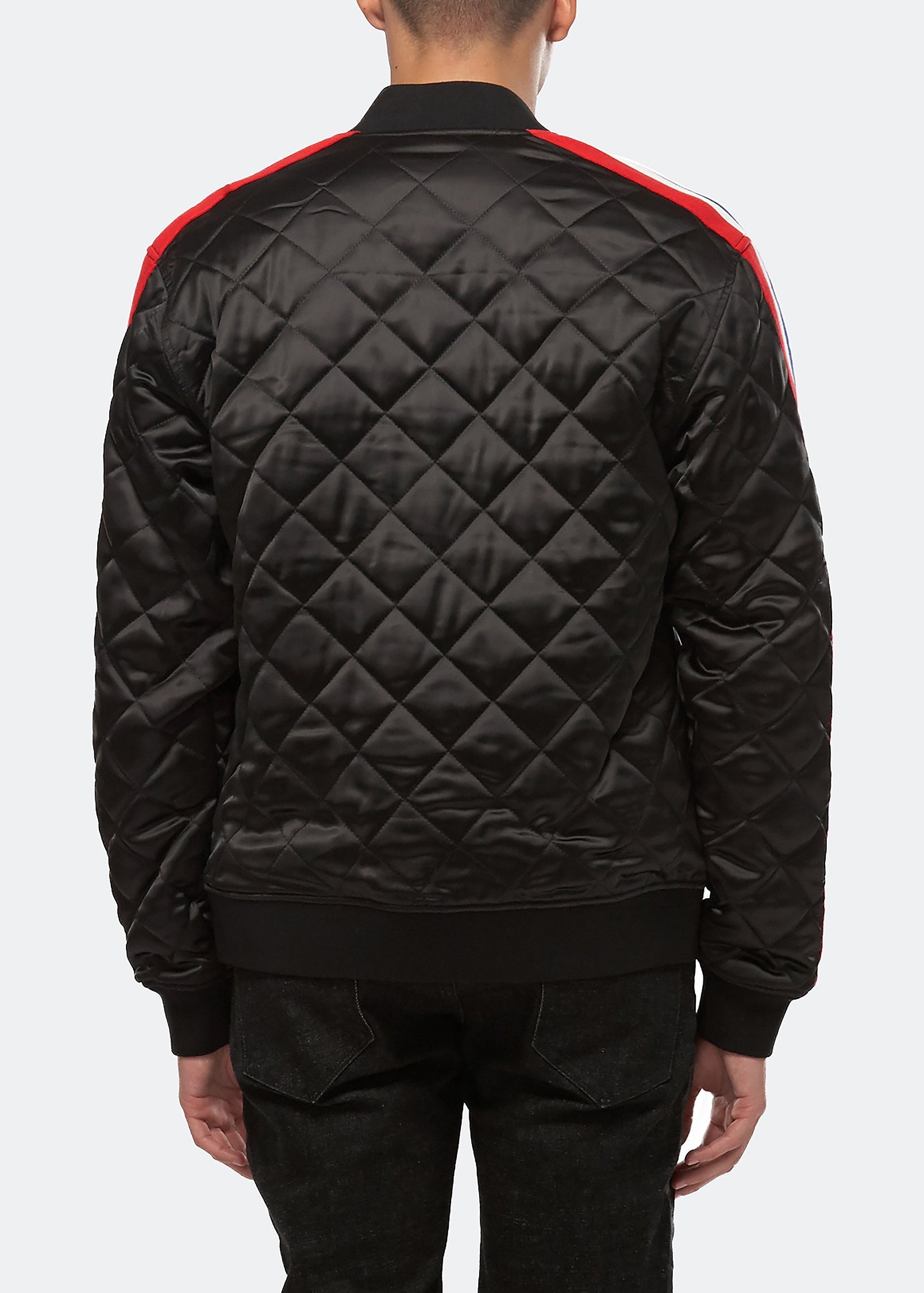 Light-filled quilted bomber jacket with blue, white, and red knit tape on sleeves and logo embroidery patch on the left chest