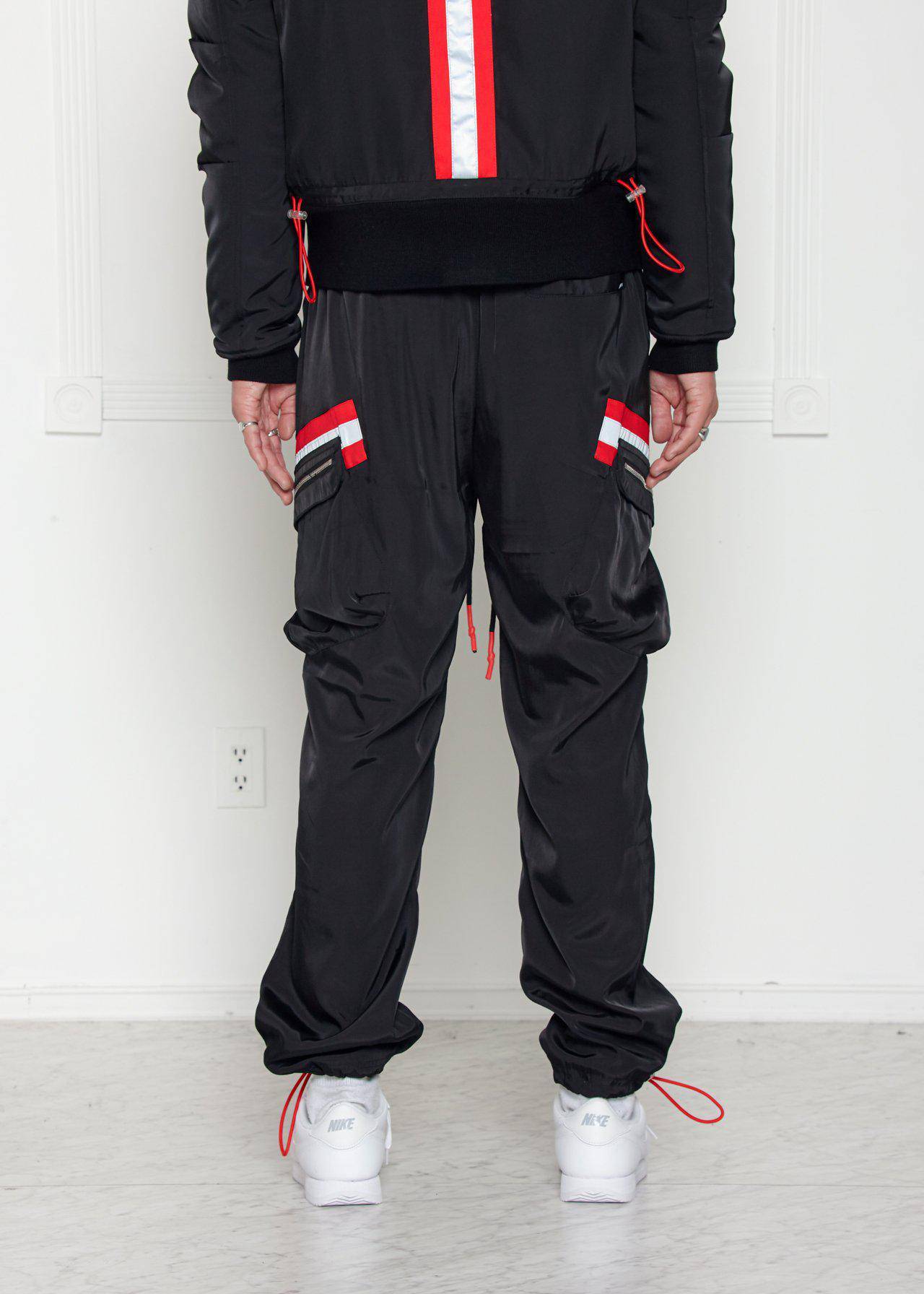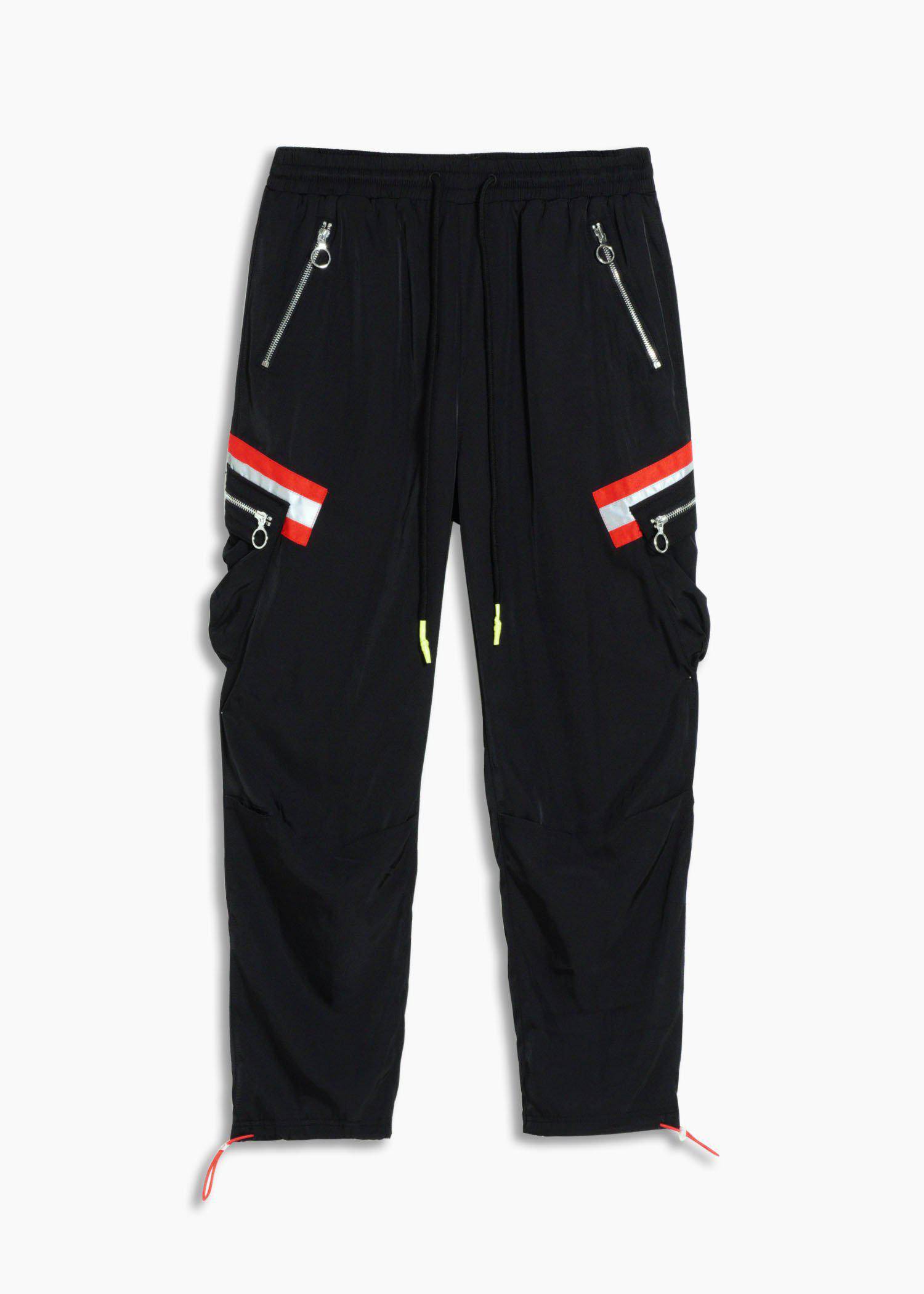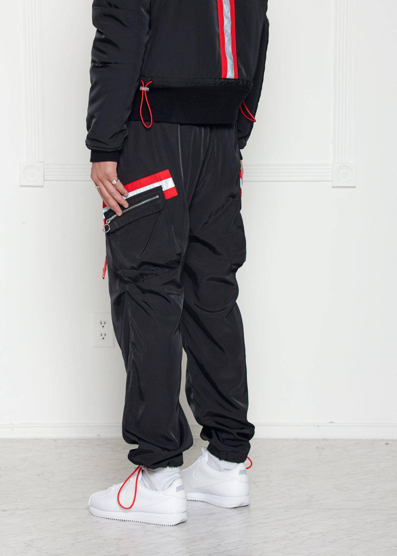 Full mesh-lined pants with an elastic waistband feature a zipper front pocket, below cargo pockets with flaps sewn over red reflective tape. They also include a red elastic cord with a stopper at the leg openings.