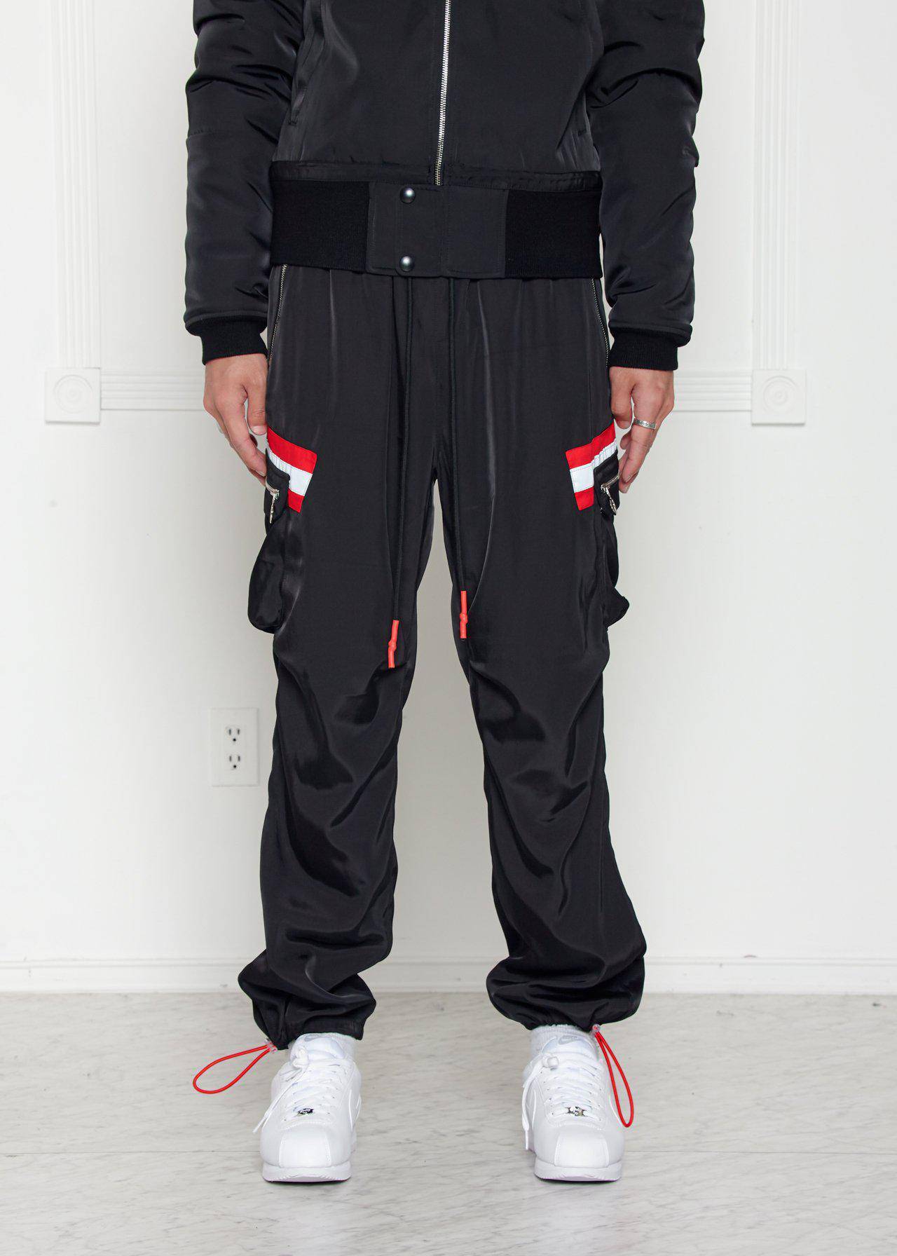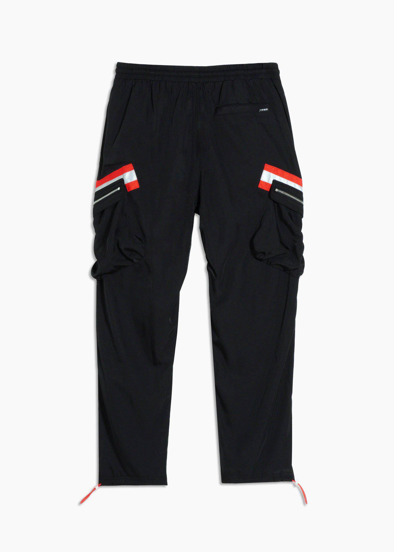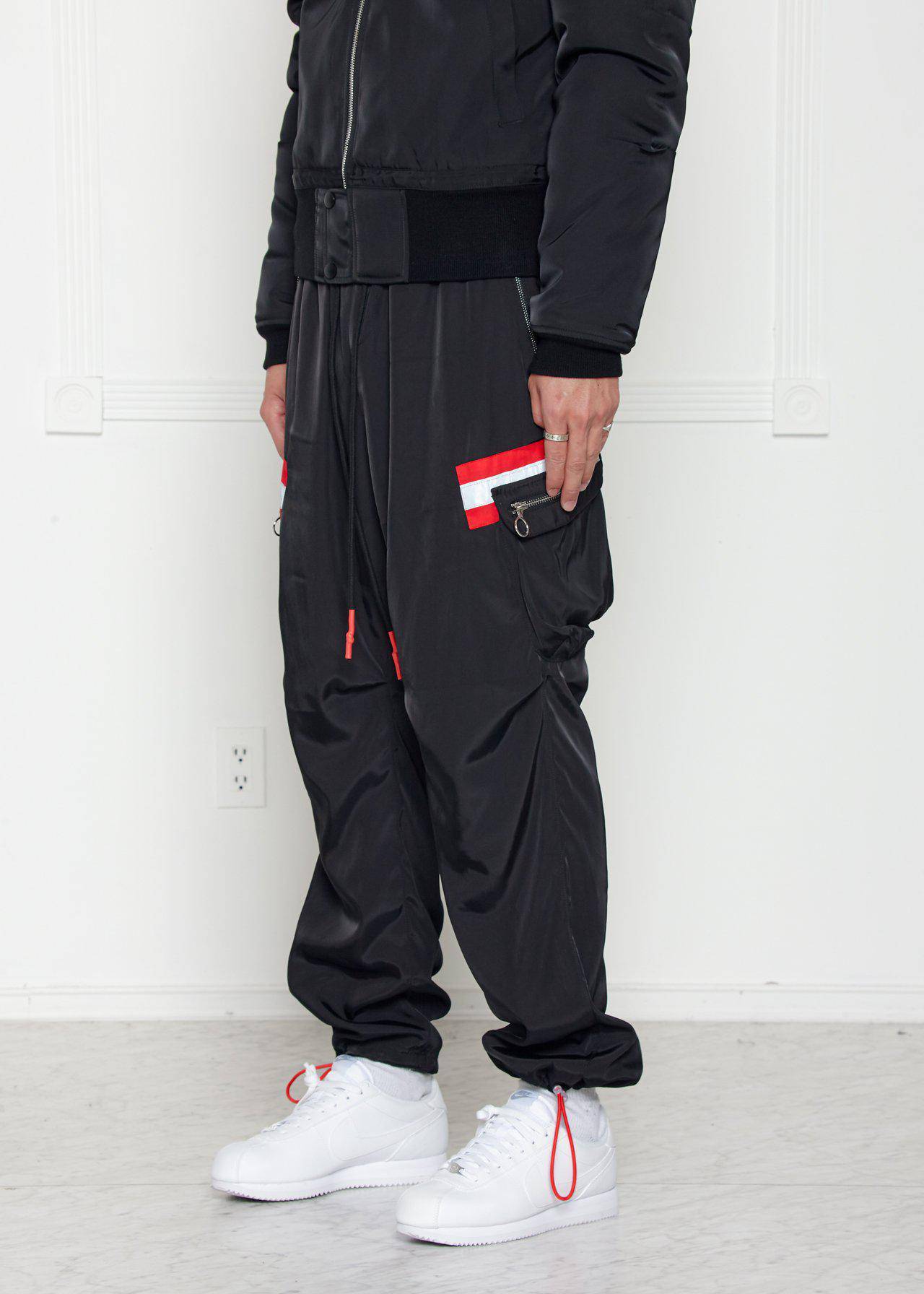 Full mesh-lined pants with an elastic waistband feature a zipper front pocket, below cargo pockets with flaps sewn over red reflective tape. They also include a red elastic cord with a stopper at the leg openings.
