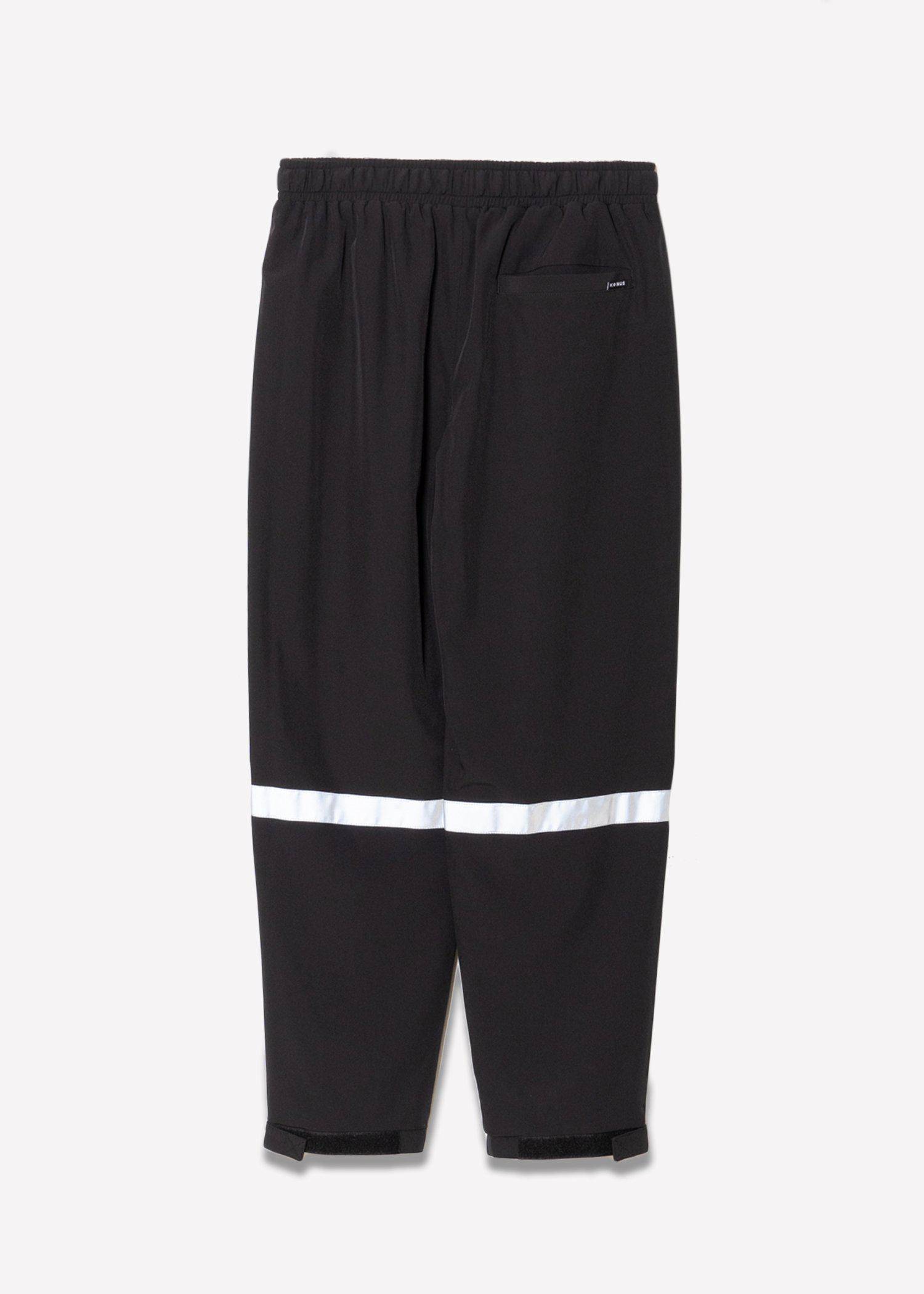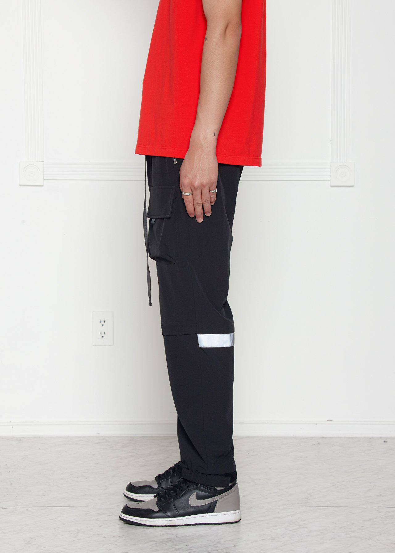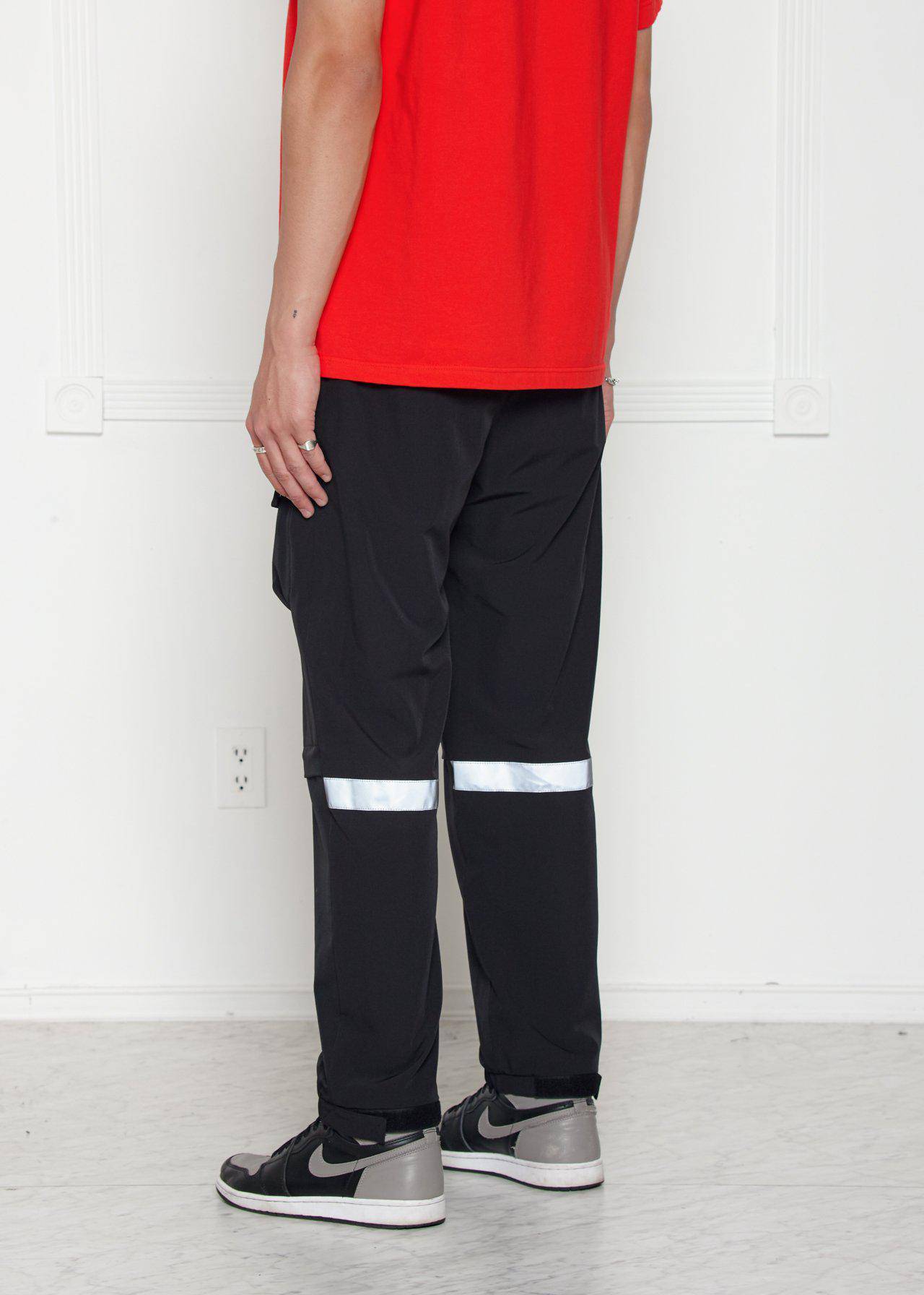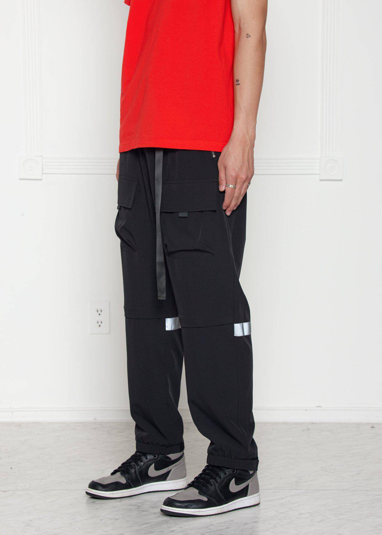 Elastic waist banded swishy pants with nylon tape and buckle closure have a front zipper and bellow cargo pockets. They also feature a zipper opening just below the knees for ventilation and reflective tape on the back legs.