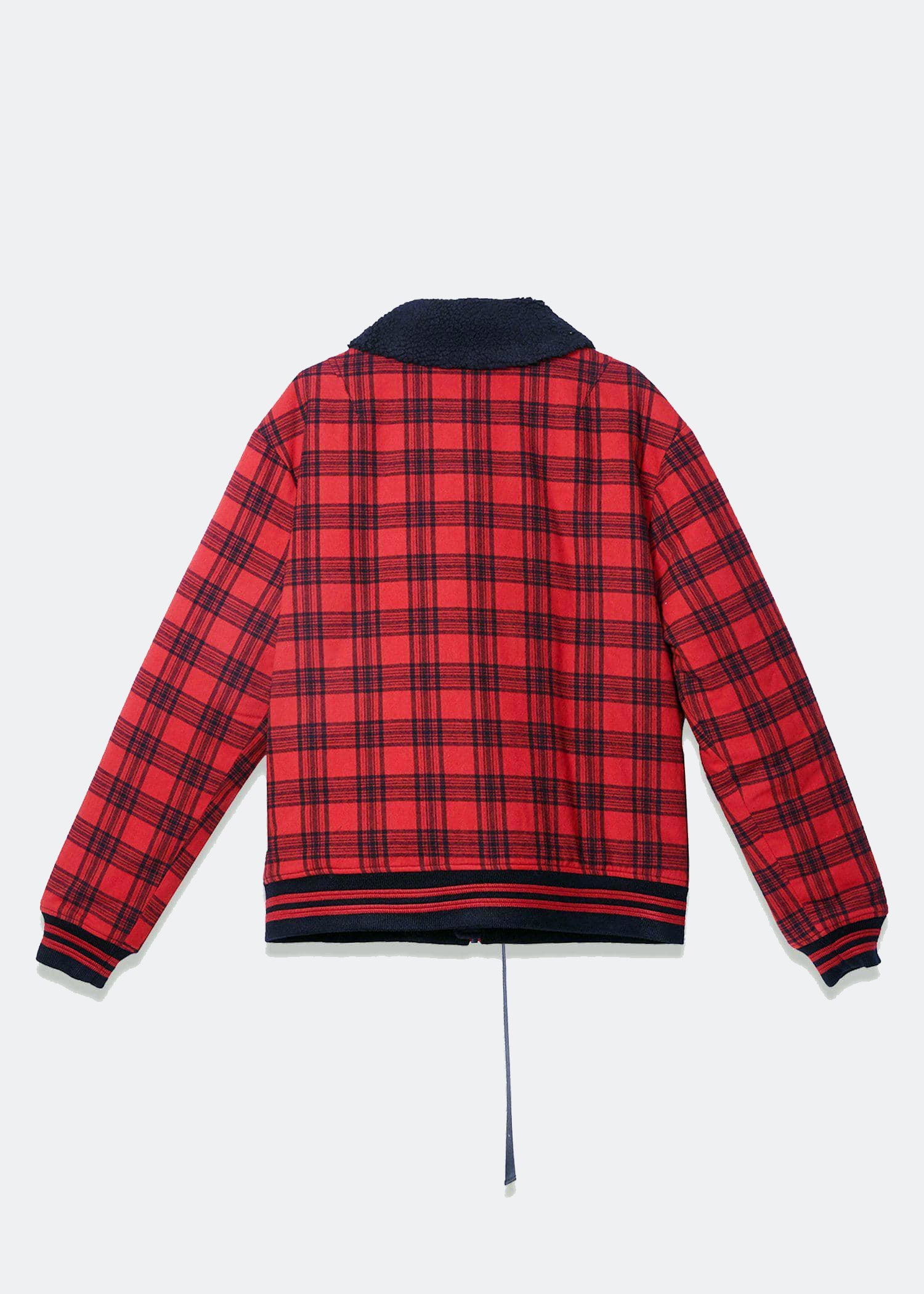 Men's MA2 bomber jacket boasts a light-filled interior and a warm Sherpa collar. It also features two front pockets, buckle closure with black nylon tape, and ribbing with black and red stripes at the cuffs and waist.