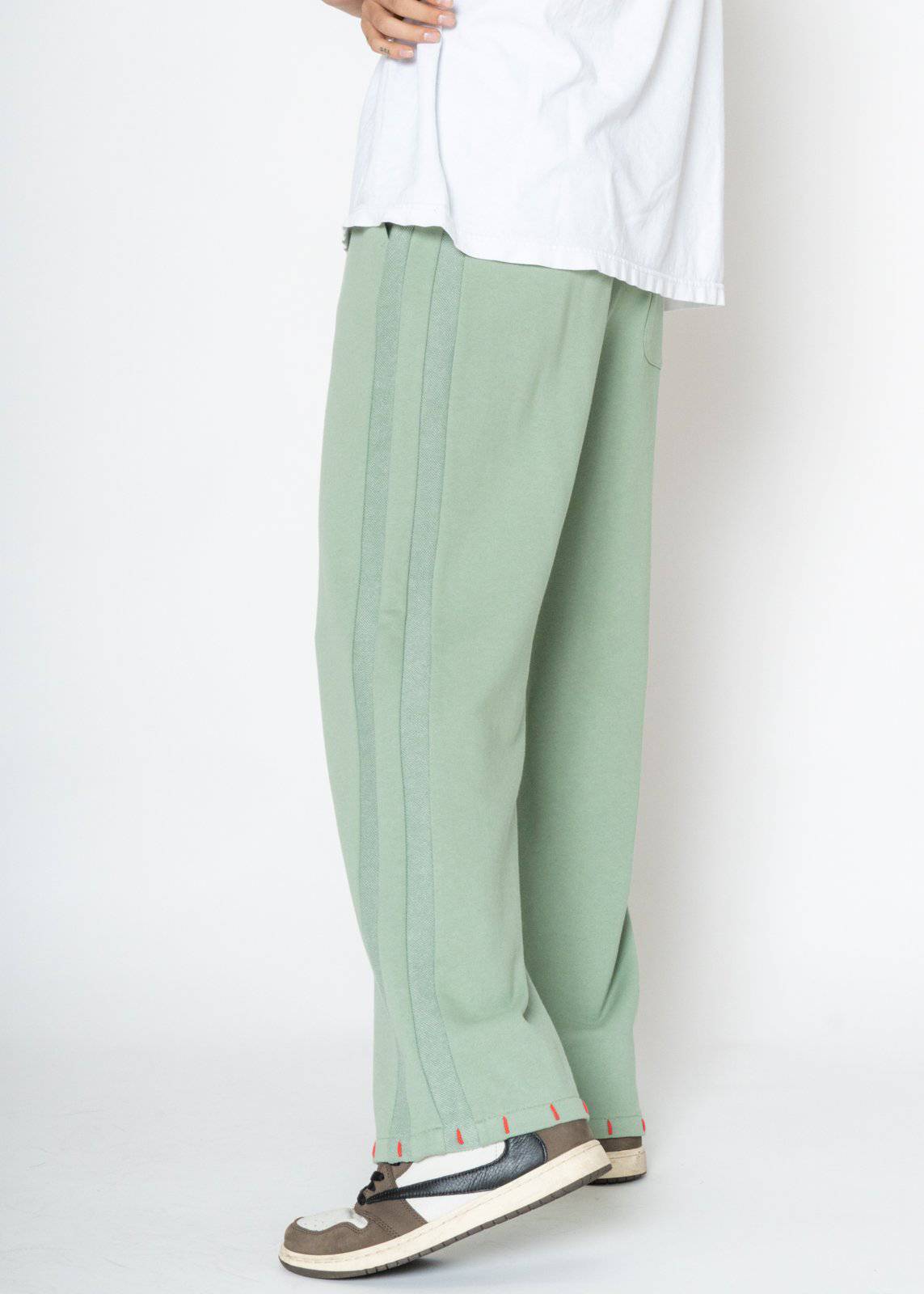 French terry sweatpants with side panel detail. Features front slash pockets, back patch pocket, and accent hand embroidery at the hem.