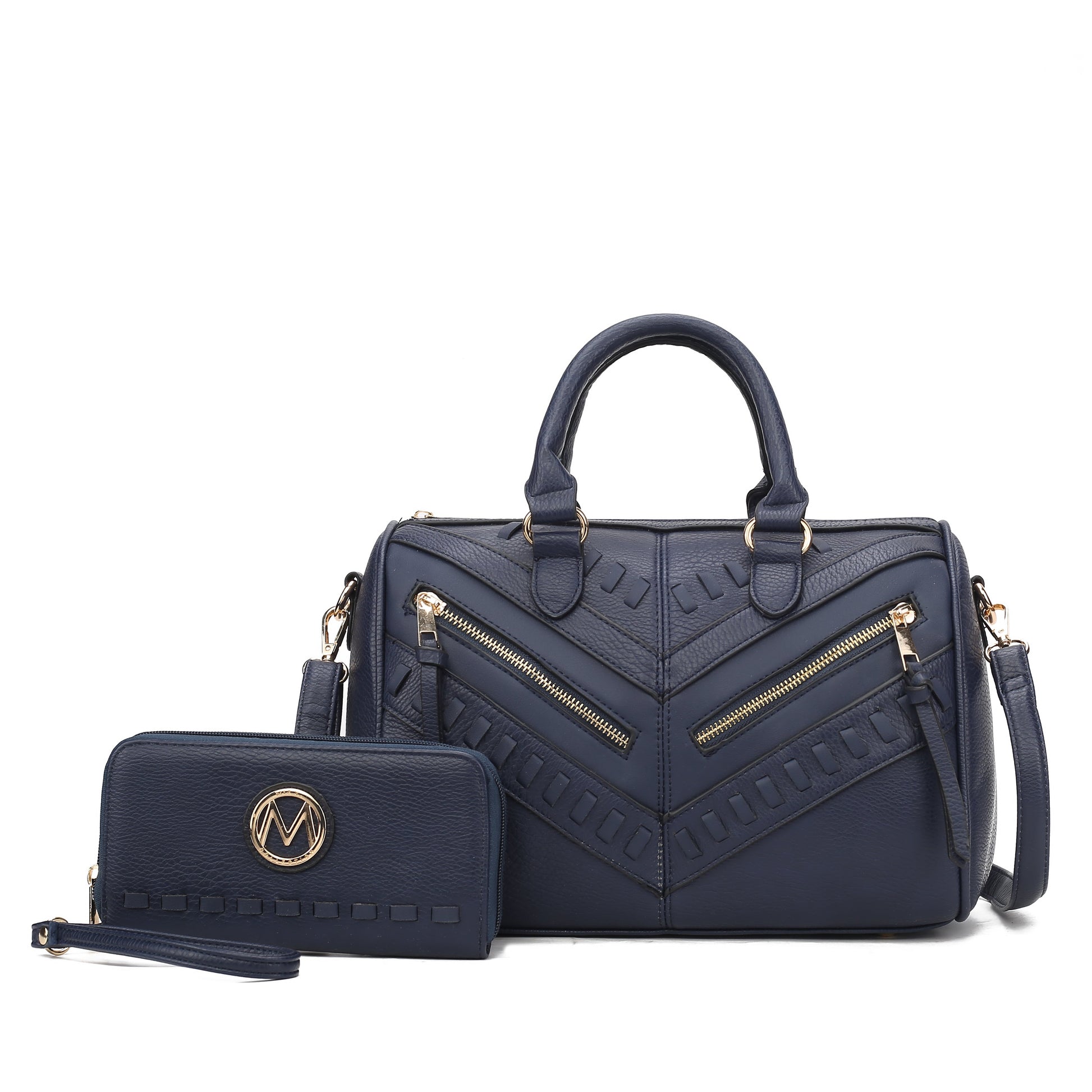 Meet the Lara Satchel Bag – a stylish and functional accessory designed for the fashion-forward individual seeking a perfect blend of urban flair and practicality. The standout feature lies in its front diagonal zipper pockets, providing both a modern visual element and convenient storage for quick-access items on the go. Intricate whipstitch details along the edges add a touch of artisanal charm and meticulous craftsmanship, setting this satchel apart. Crafted from high-quality vegan leather, the bag's durable and structured design opens with a top zipper closure to reveal a well-organized interior with protective feet. The ensemble includes a matching wallet, ensuring a cohesive and polished look without compromising functionality. With sturdy handles and an adjustable, detachable strap, the Lara Satchel is your go-to accessory for making a bold style statement, whether heading to the office or on a weekend adventure. Embrace modern aesthetics and practical design with this eye-catching satchel.