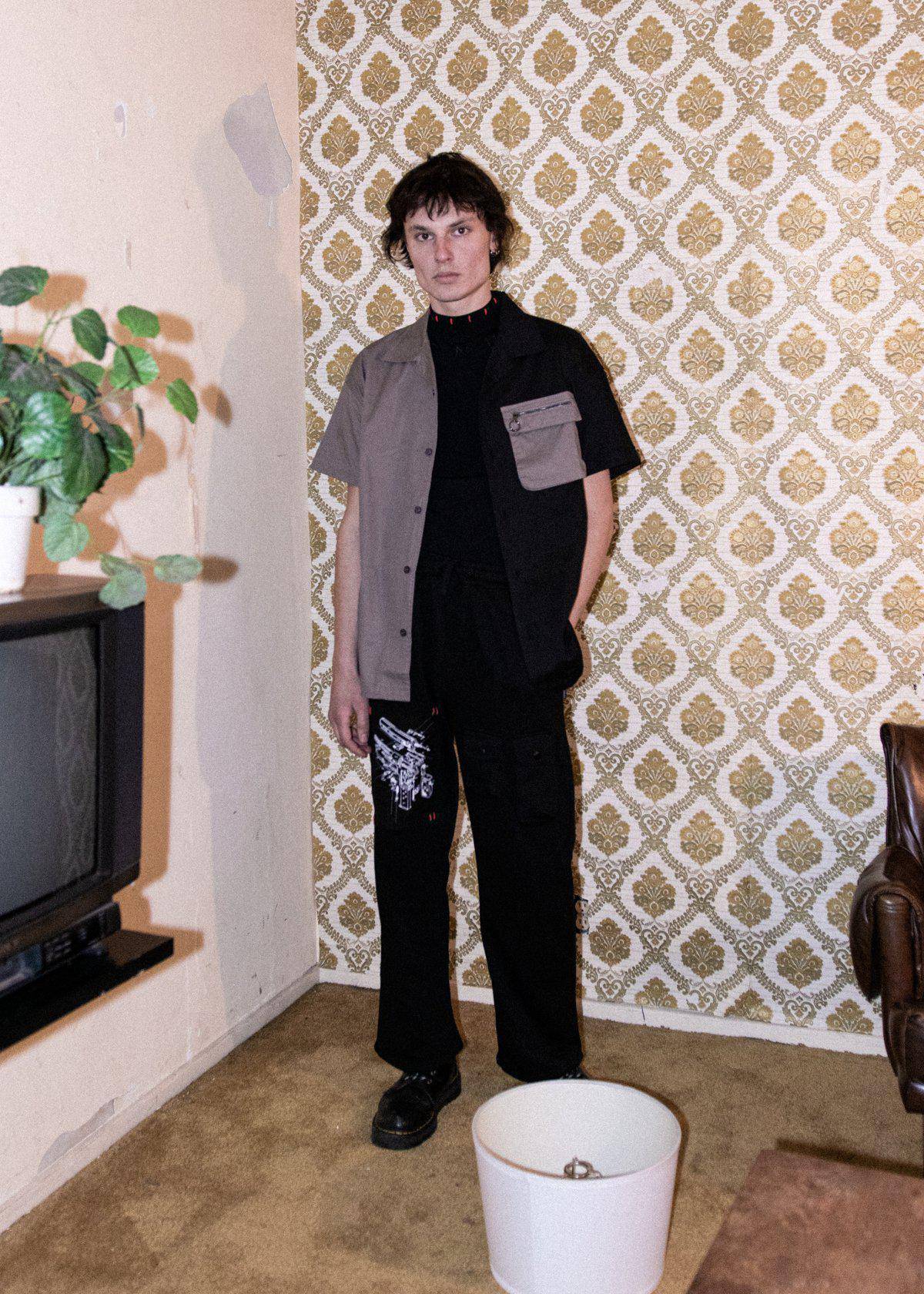 Short sleeve revere collar shirt with color blocking and chest bellow pocket with flap