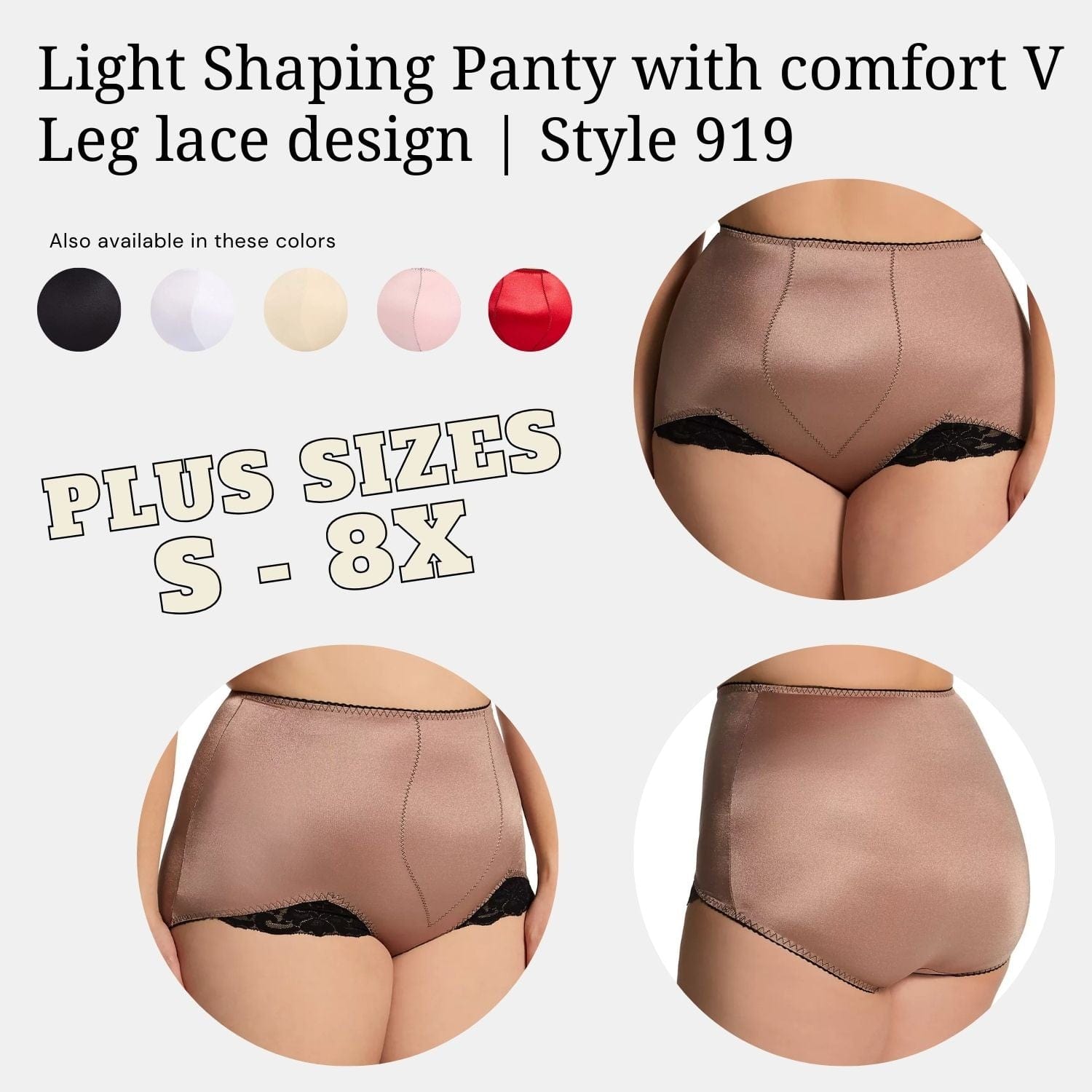 The Rago Light Shaping V Leg Brief Panty with Lace 919 provides light control and all-day comfort. Shaped tear-drop front panel for tummy control. Rago's Light Shaping V Leg Brief Panty with Lace features four-way soft stretch nylon with Invista Lycra spandex for ultimate comfort.