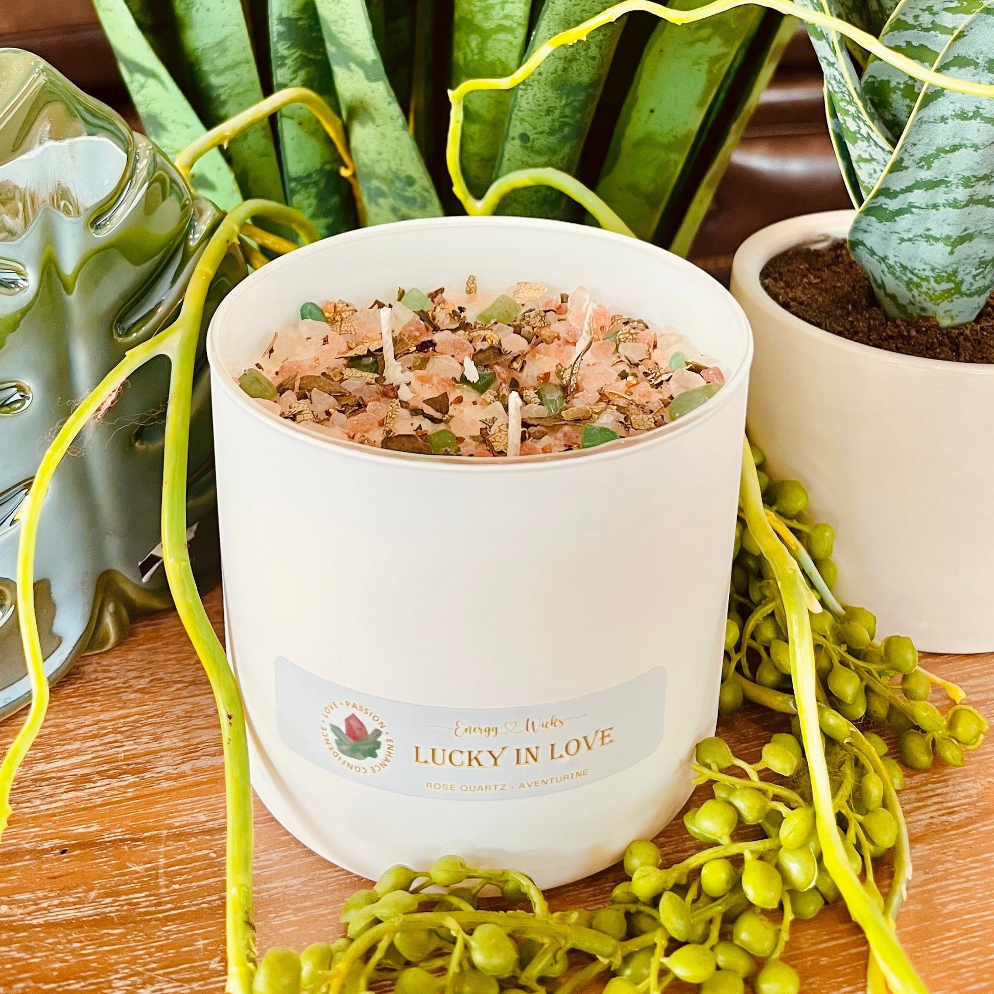 Our Lucky in Love crystal intention candle is perfect for anyone looking to attract more love into their life. Made with Rose Quartz, Aventurine, and Yerba Santa, this crystal intention candle is perfect for setting the mood and generating positive energy. The sweet pea fragrance adds an extra touch of romance. Light this candle when you're ready to welcome more love into your life.