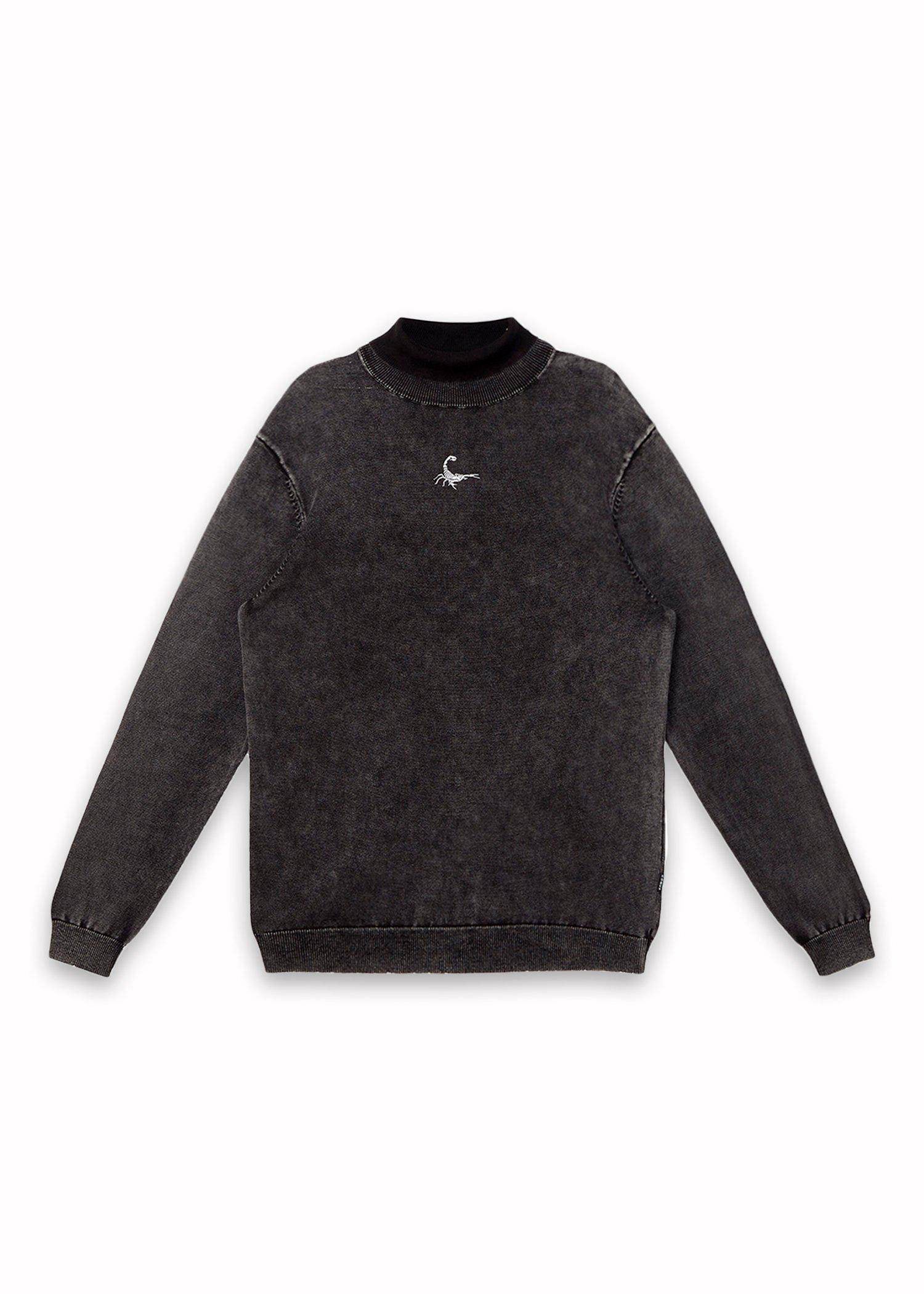 A fully fashioned long sleeve turtle neck sweater with acid wash comes with scorpion embroidery in silver thread on the chest