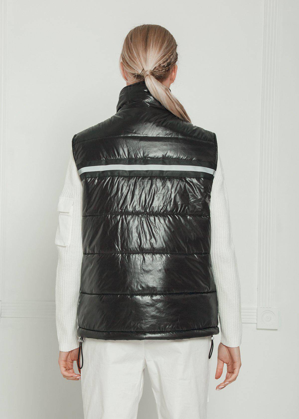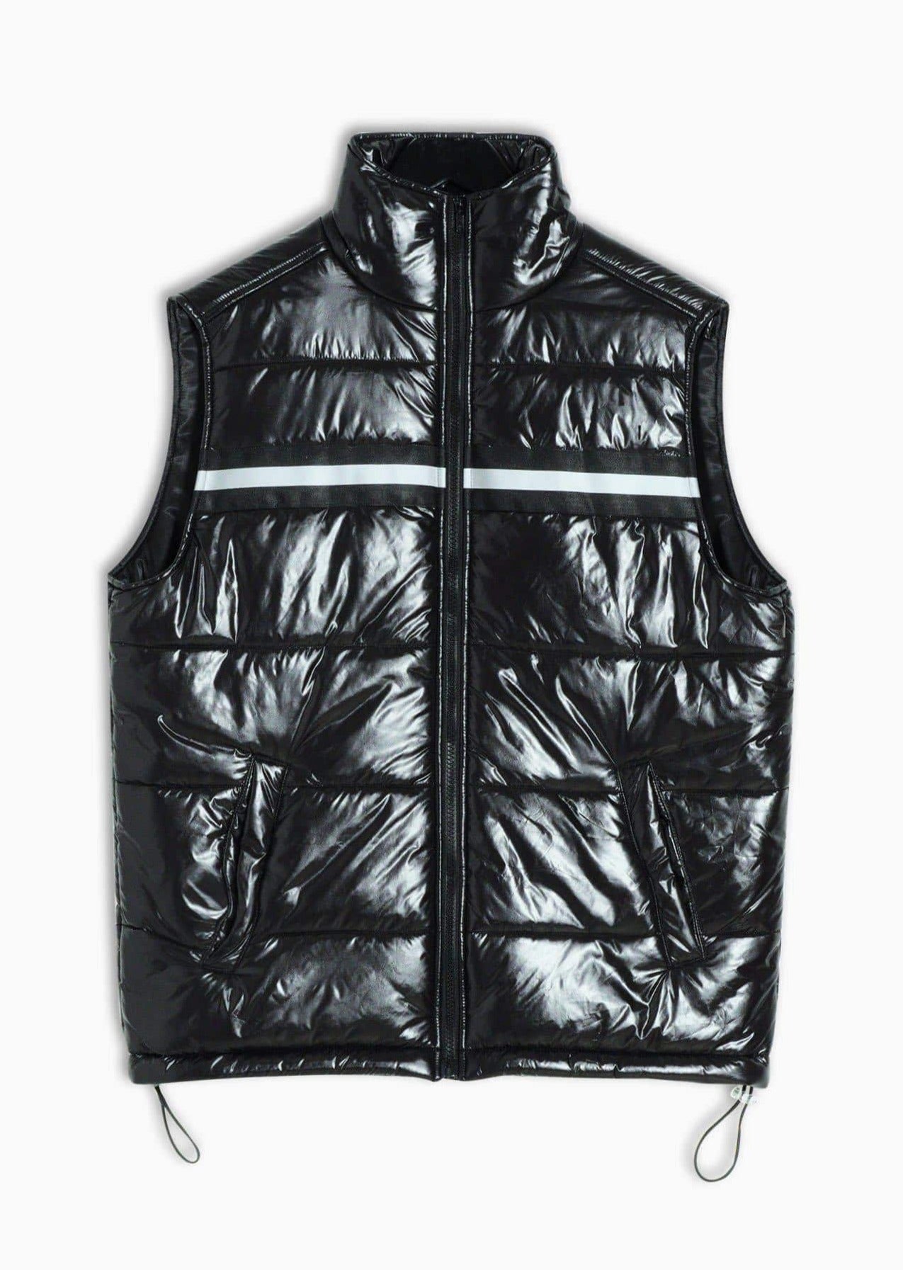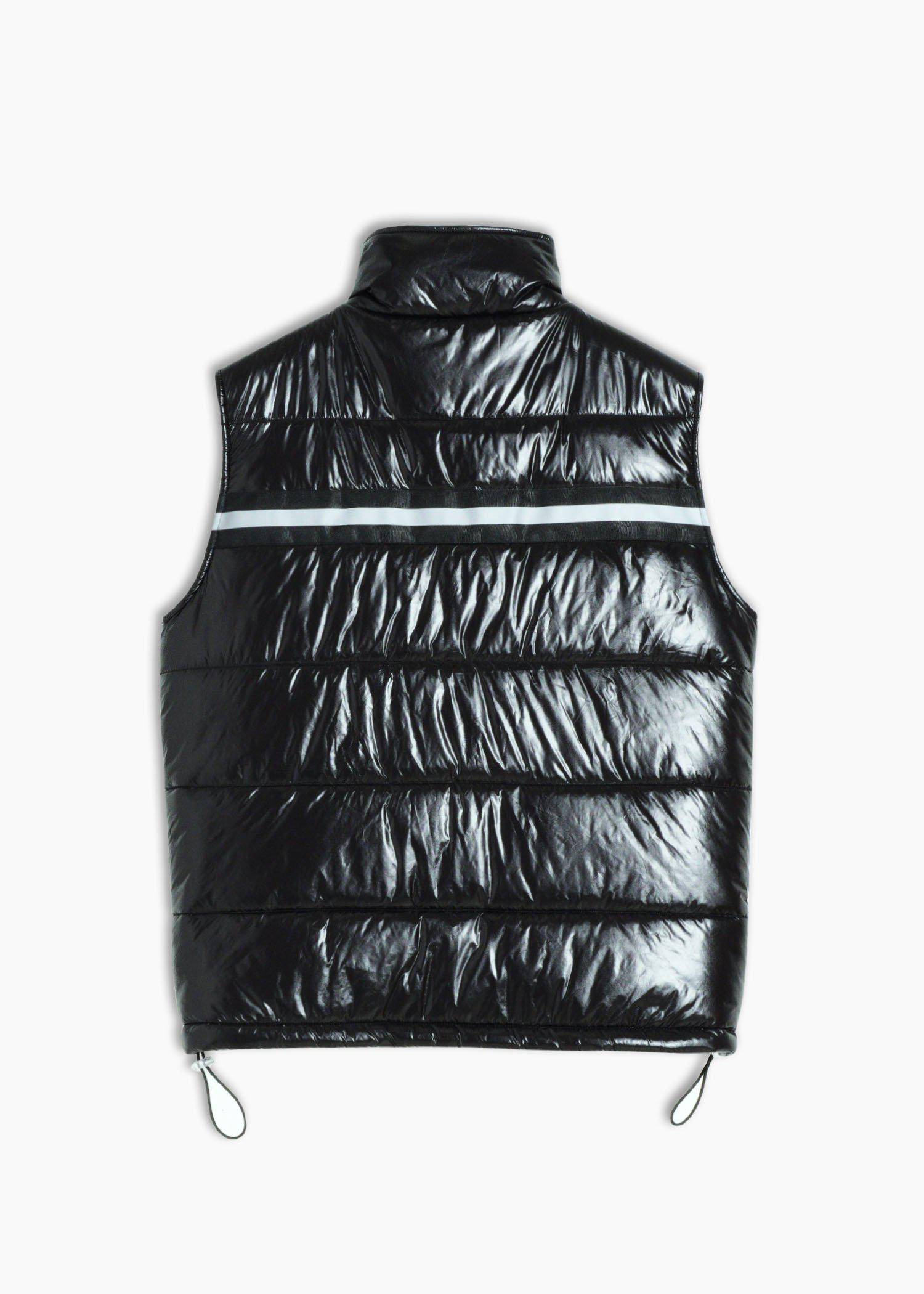 Poly-filled zip-up vest with elastic cord at hem and reflective stripe on chest and back.