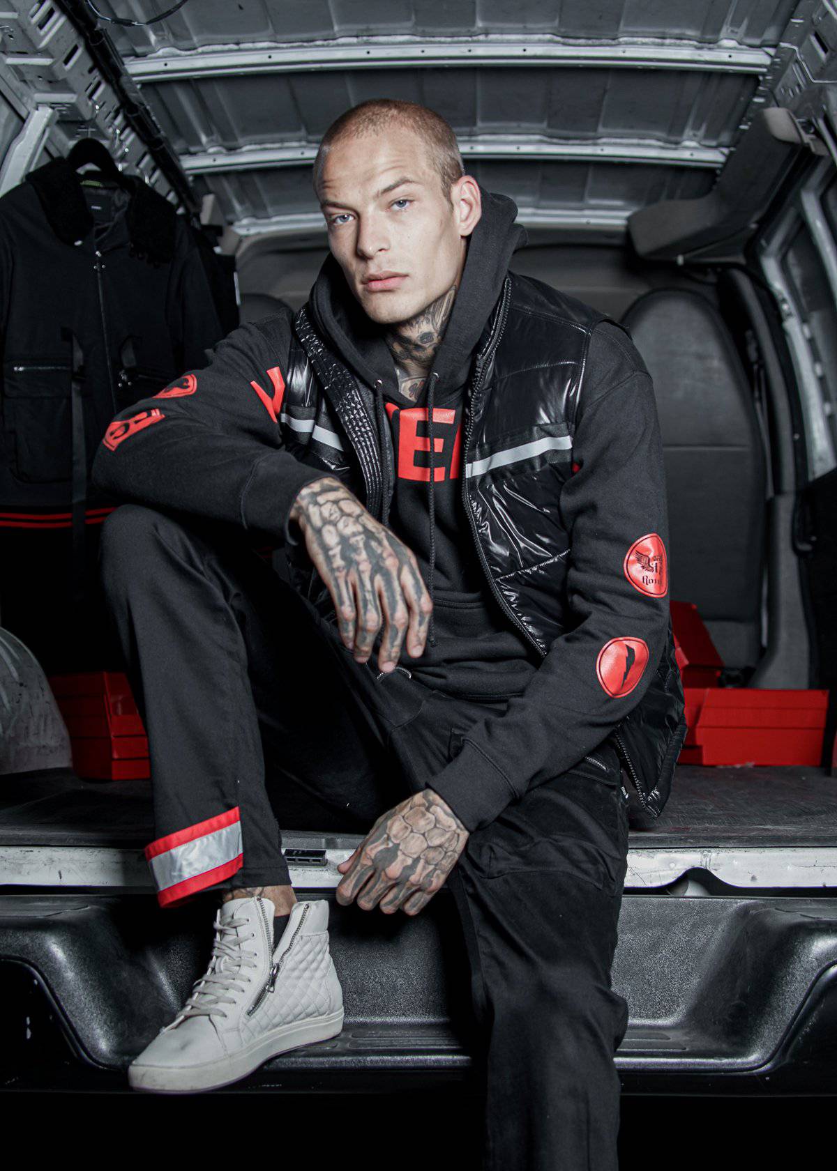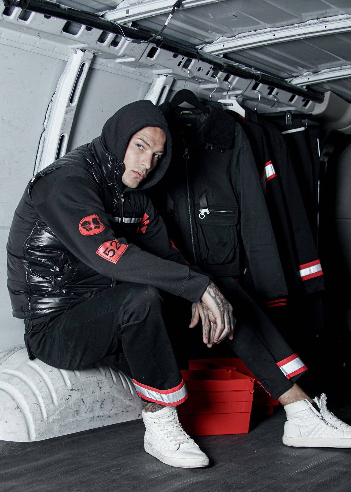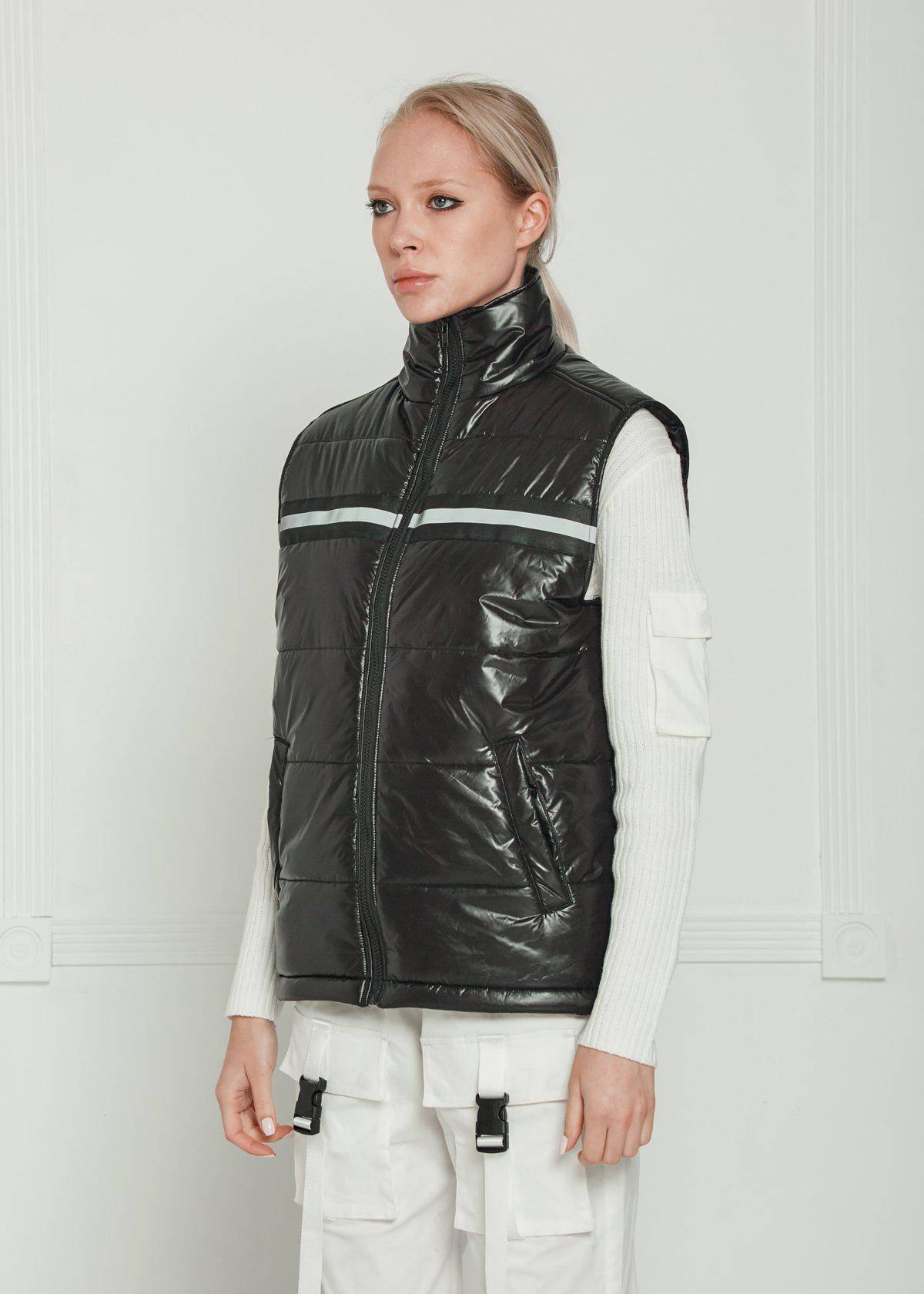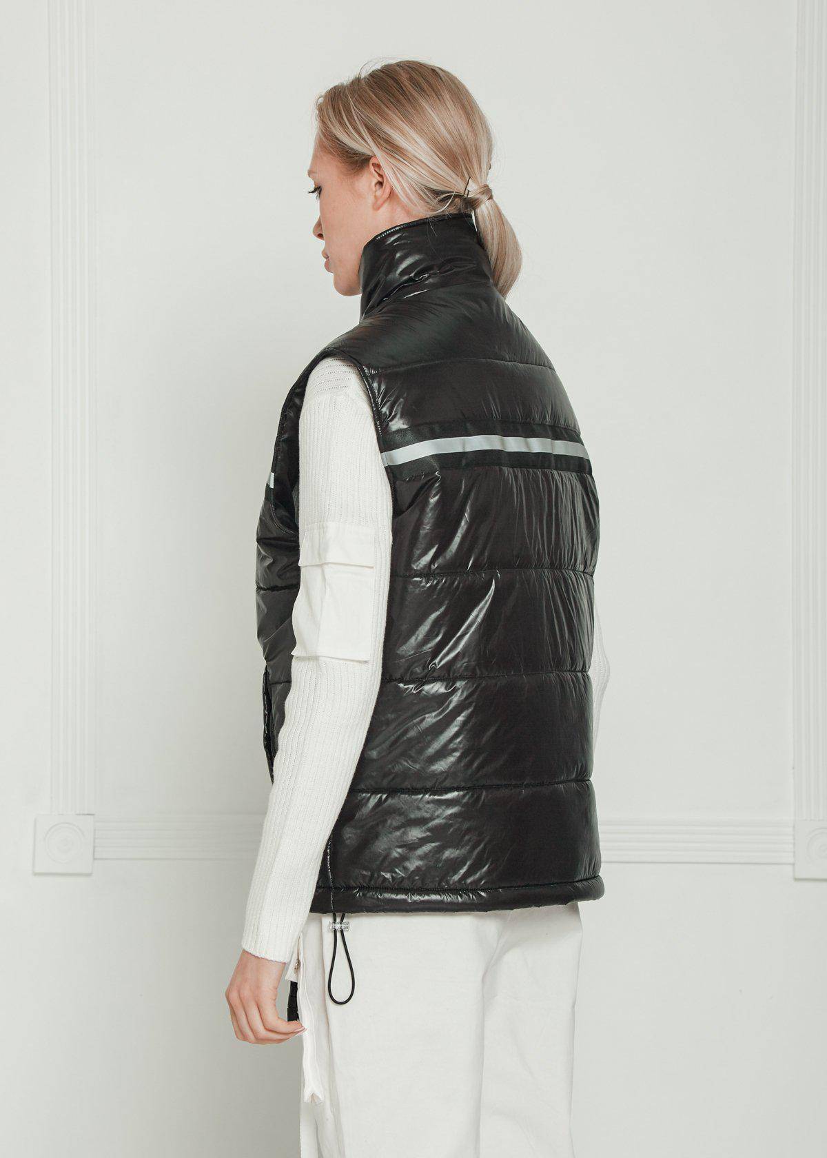 Poly-filled zip-up vest with elastic cord at hem and reflective stripe on chest and back.