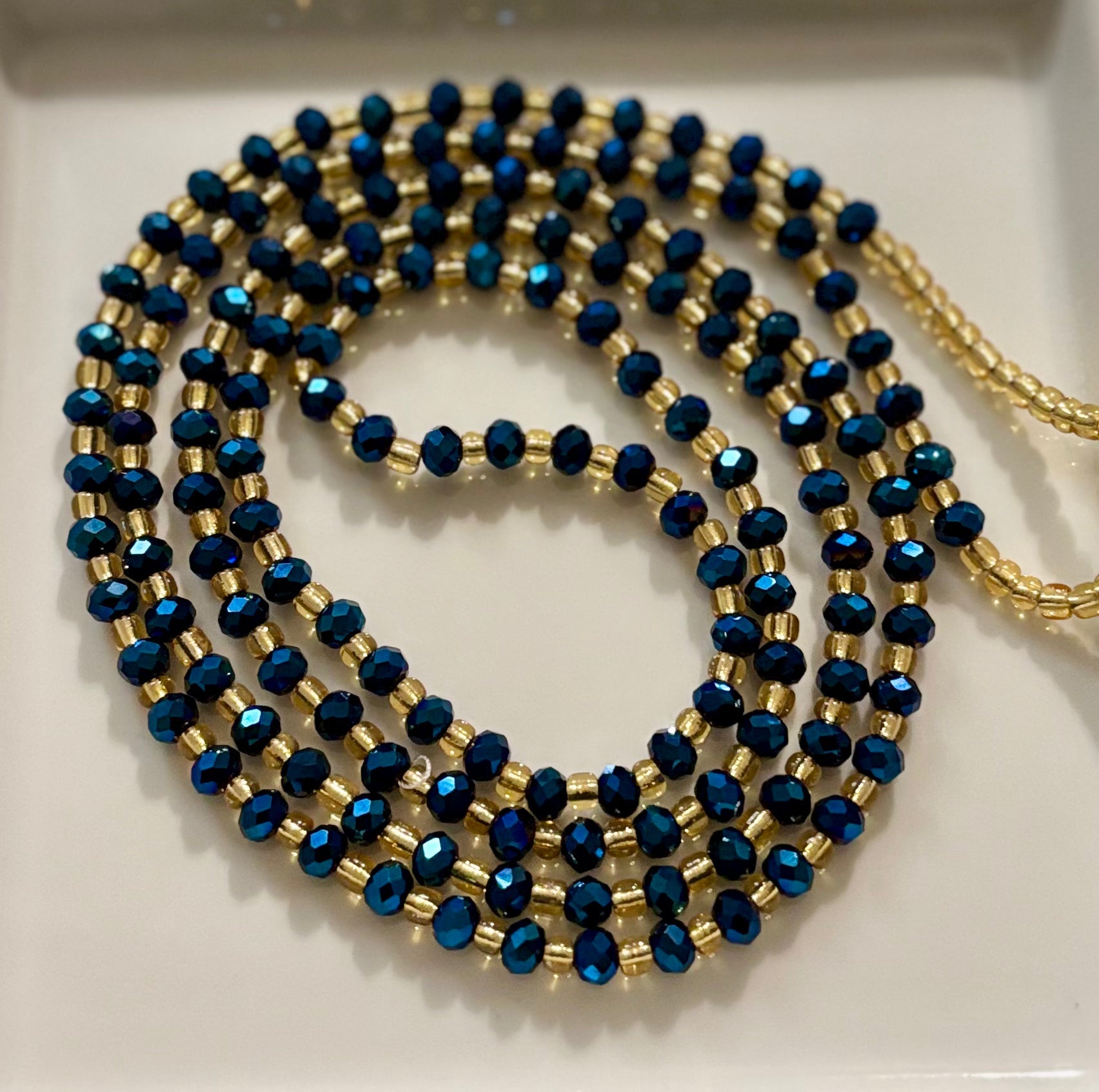 Step into your power with the “Midnight Majesty” waistbeads—a regal fusion of deep blue faceted beads and radiant gold accents. Each shimmering sapphire-toned bead evokes the mystery and calm of the night sky, while the gold cylinders reflect light like miniature sunbursts, infusing your aura with warmth and grace. Whether worn for personal intention, aesthetic flair, or energetic alignment, this strand speaks to queens who walk with quiet confidence and bold presence.