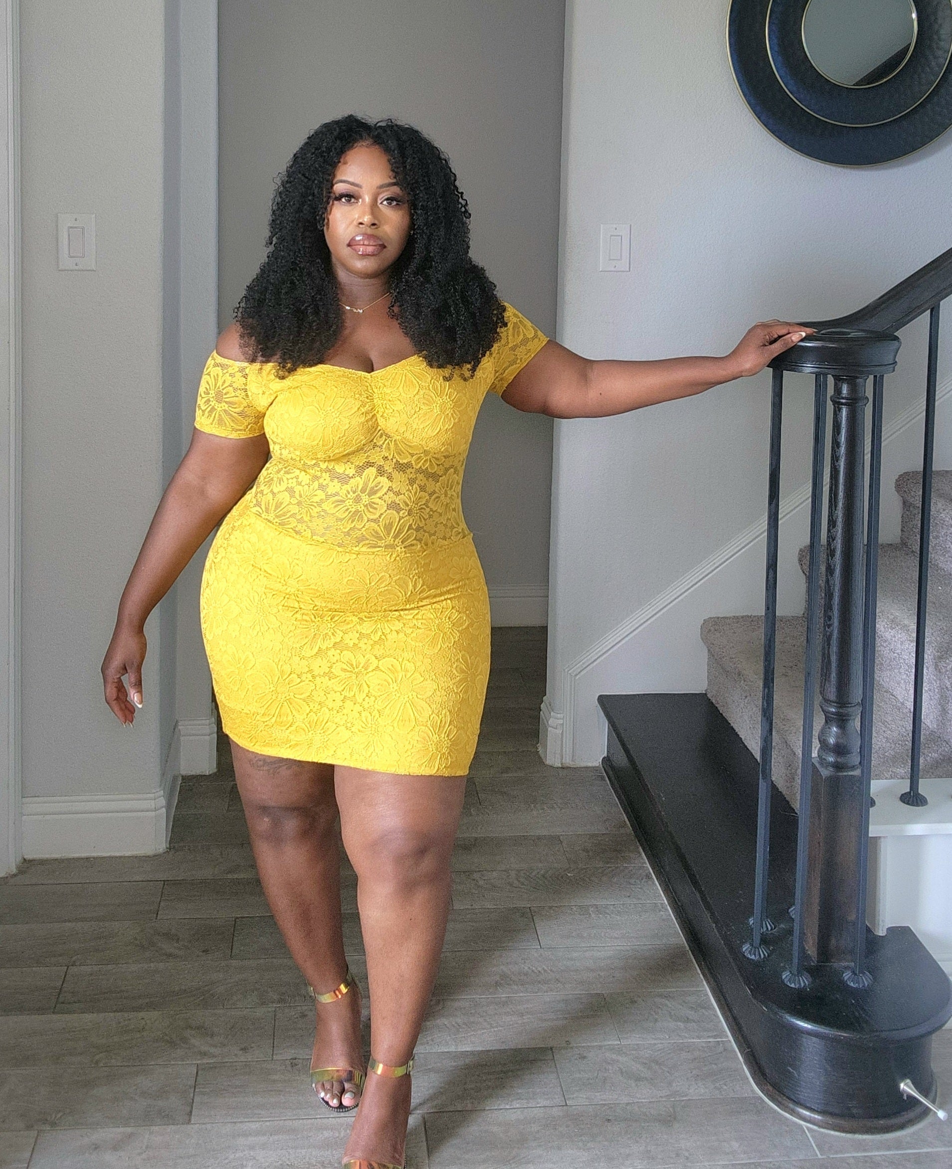 Mustard. Lace mini dress with lining layer on off shoulders.