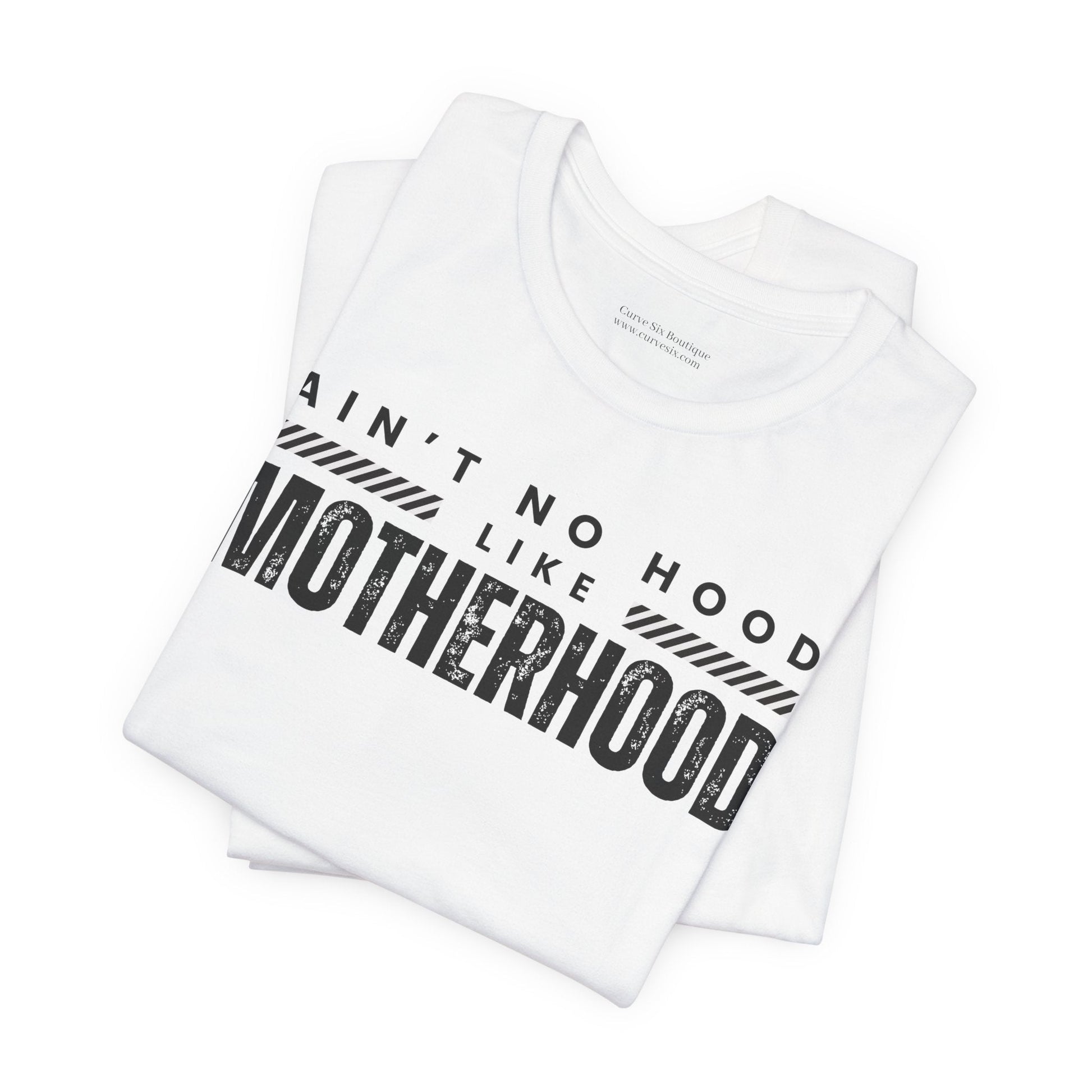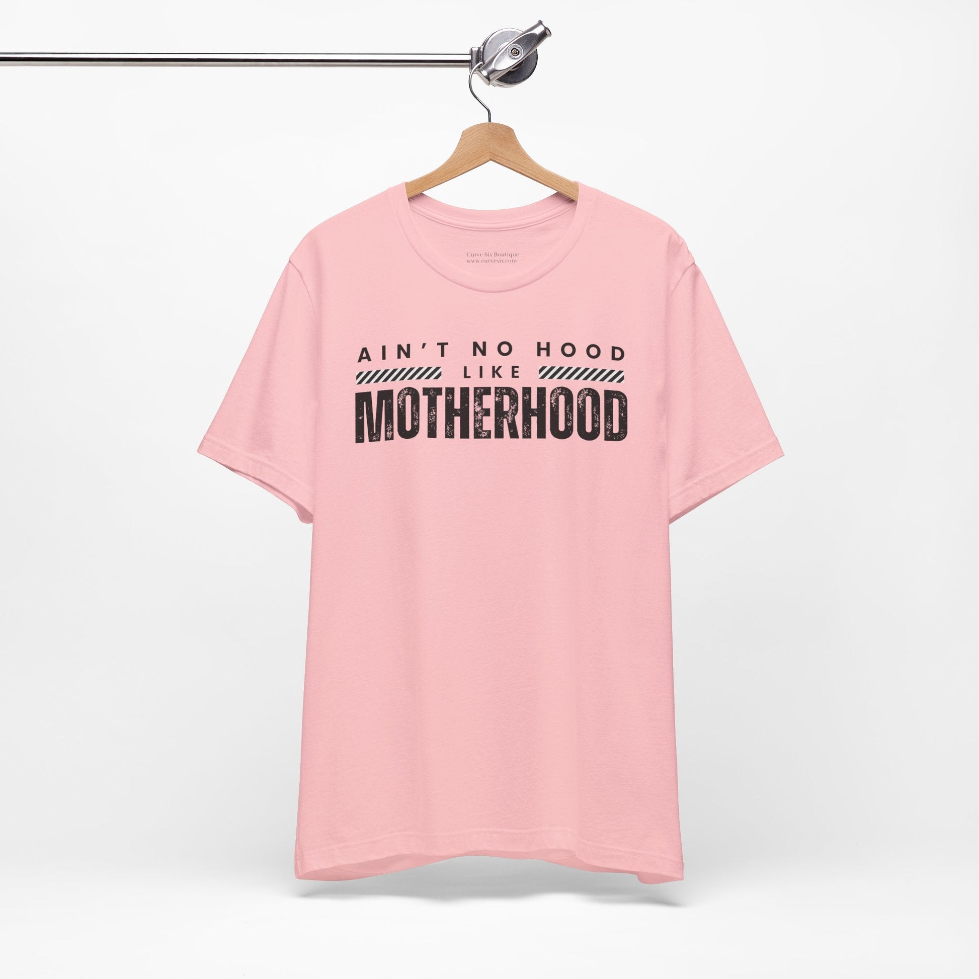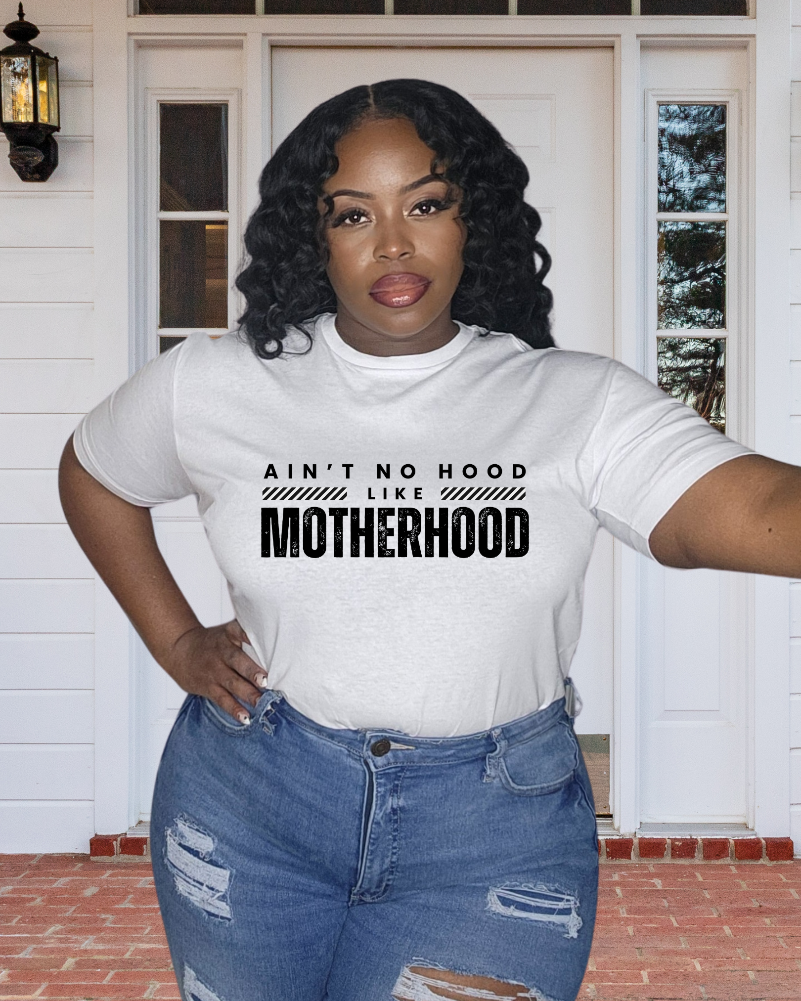 Graphic design tee with "Ain't No Hood Like Motherhood".