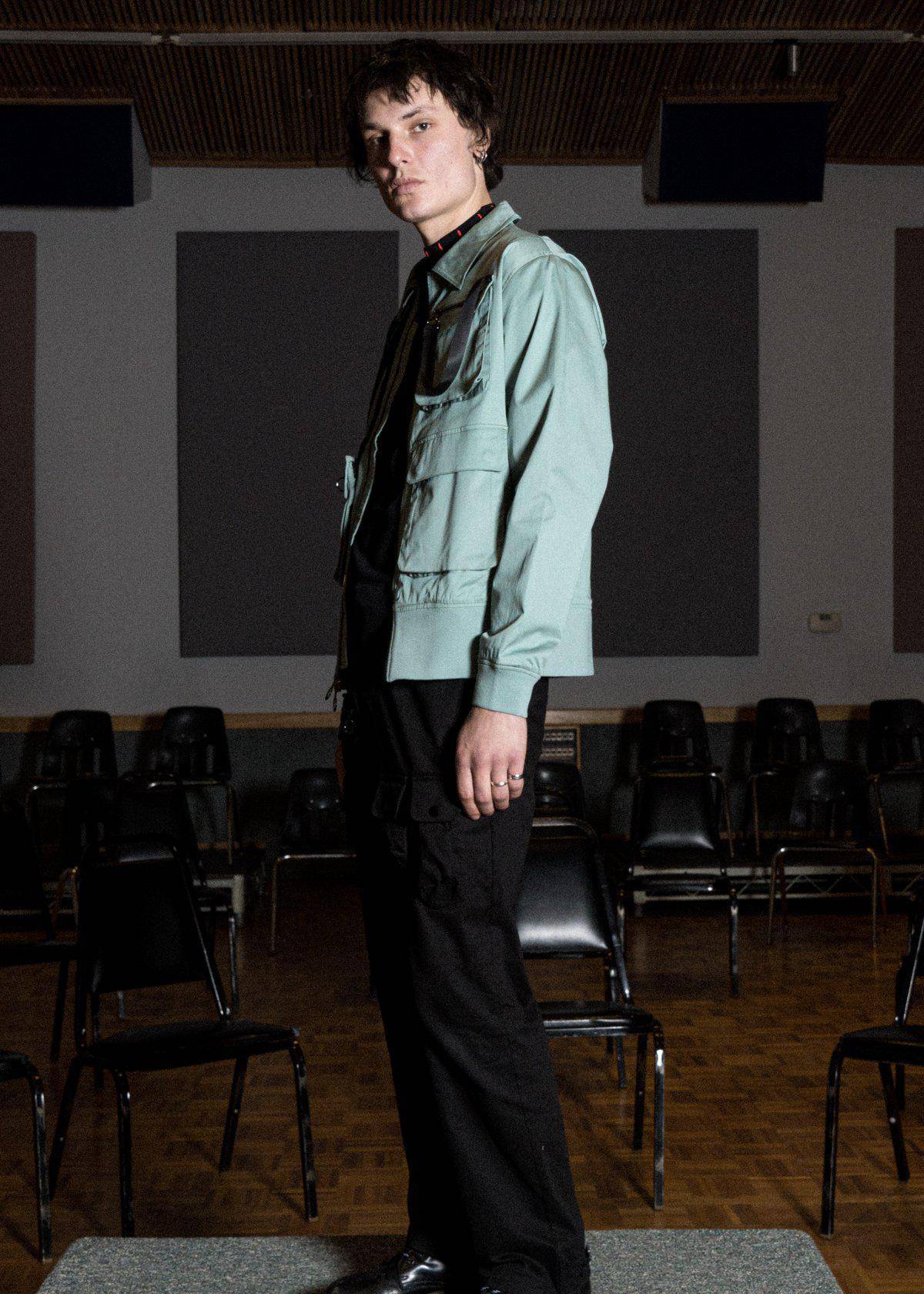 Jacket with bellow pockets with flaps on the left side of the jacket and detachable bellow pocket with flap with velcro tapes on the right side. Also features bird logo embroidery on the back of sleeve.