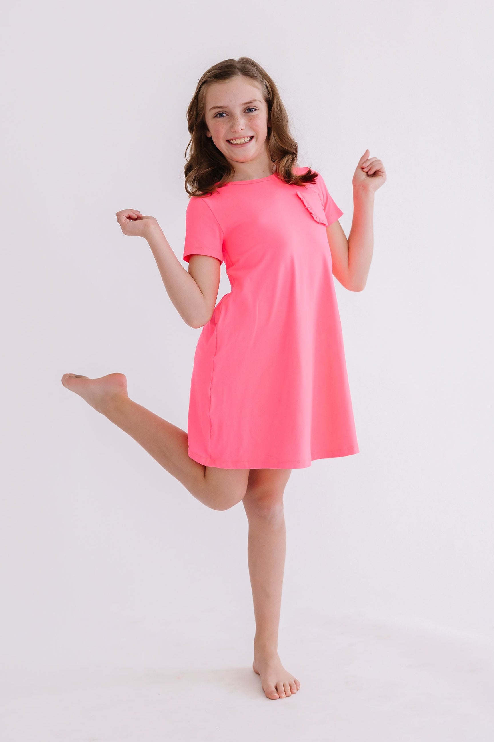 Our T-Shirt Dress is casual, comfortable but still girly. Perfect for school or the playground. Mix and match with our twirl shorts or leggings for a perfect, yet practical, outfit. Dress is finished off with a cute ruffle pocket.