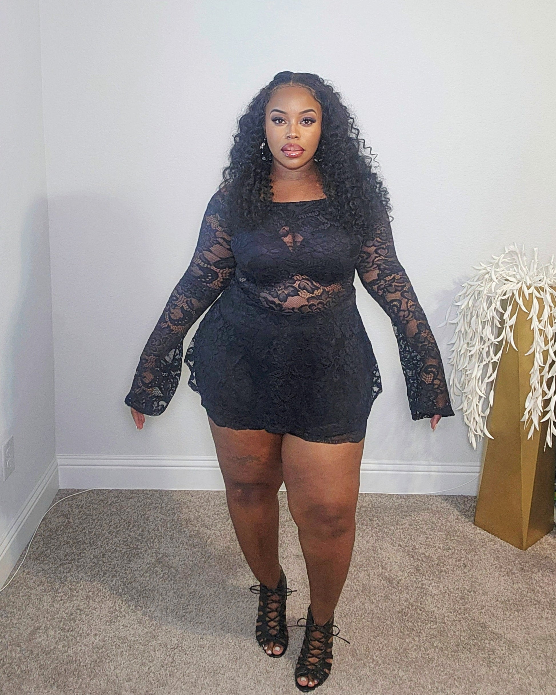 Black. Lace off the shoulder, long bell sleeve top with lace trimmed biker shorts