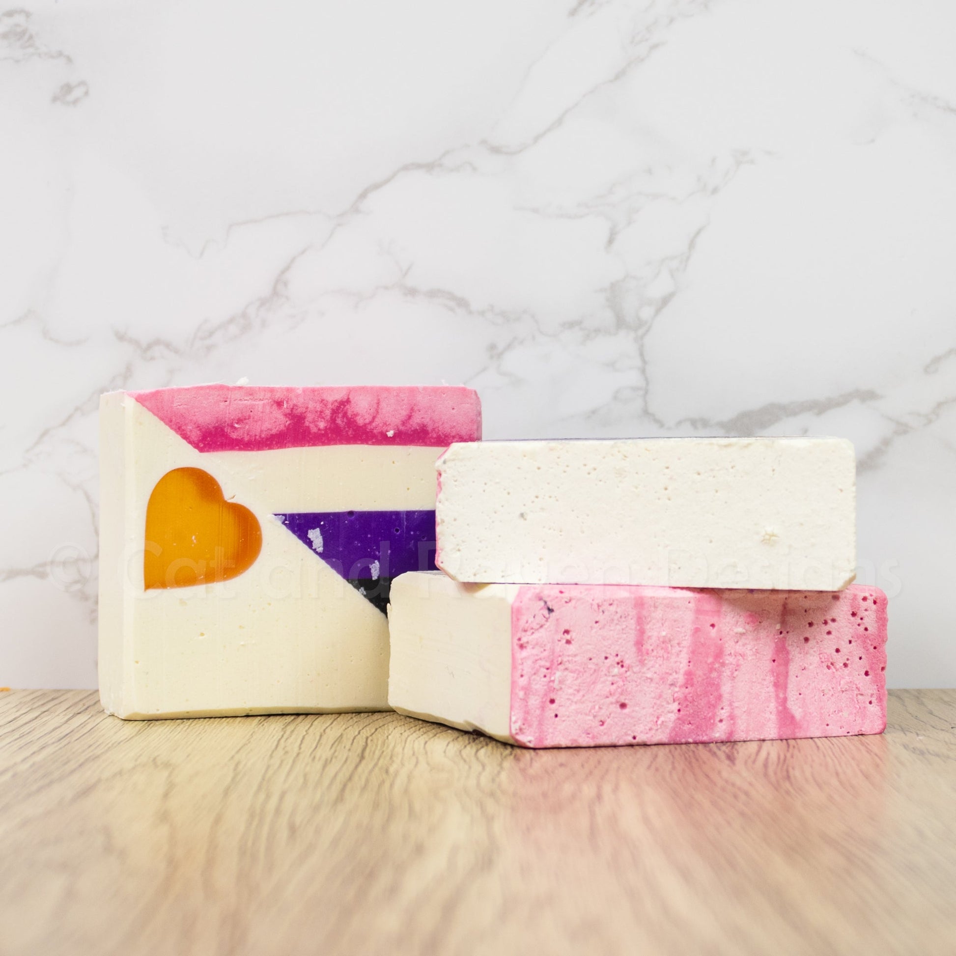 Ingredients: olive oil, coconut oil, palm oil (RSPO), sodium hydroxide, almond oil, castor oil, glycerin melt & pour embeds, sodium lactate, fragrance, micas, and bioglitter.