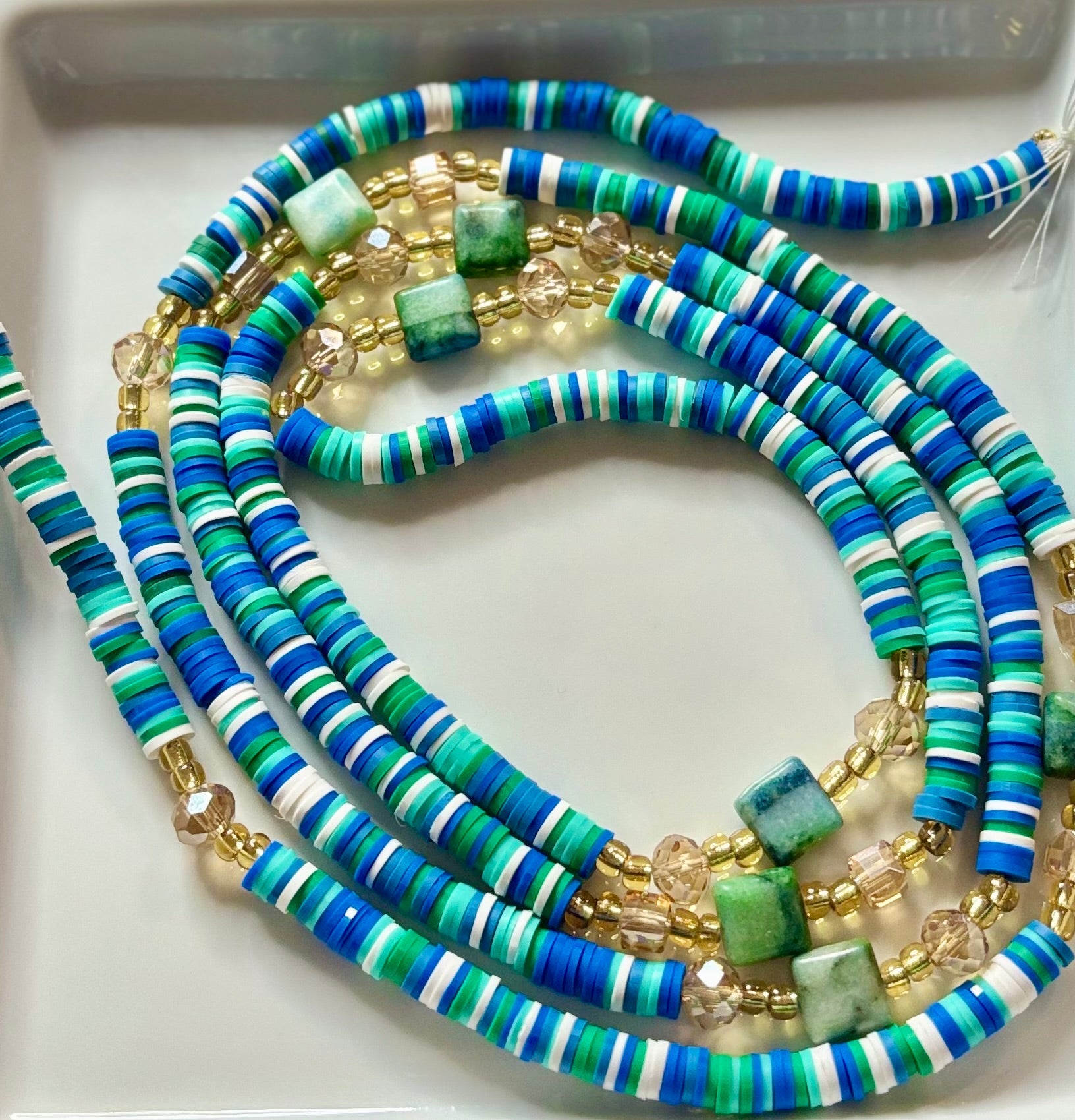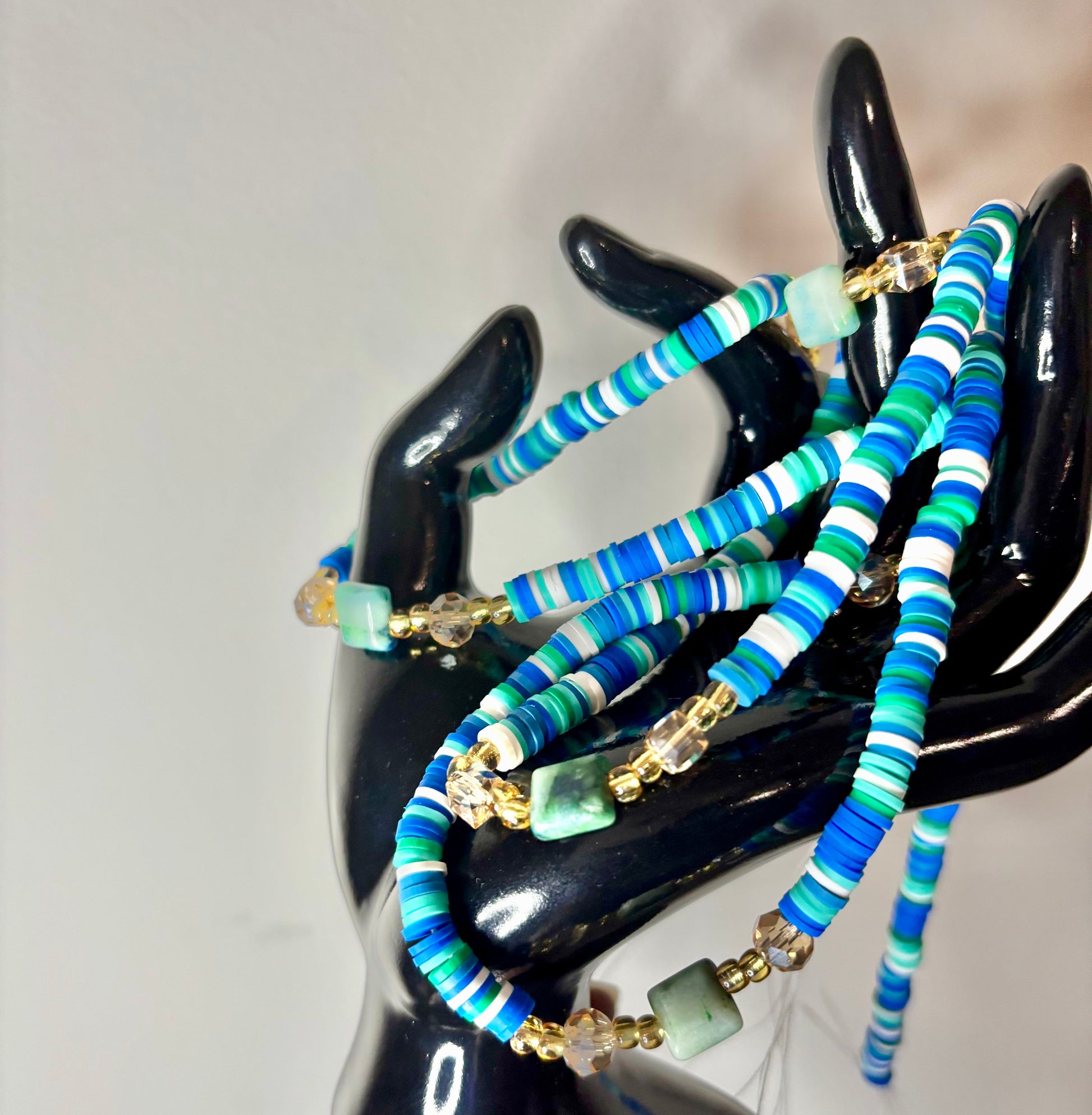 Let your spirit flow with Ocean Whispers, a strand that channels the calming rhythm of ocean tides and the clarity of coastal skies. Flat disc beads in turquoise, seafoam, and ivory evoke waves lapping against sun-warmed shores, while faceted gold and crystal accents shimmer like sunlight on water. Square-cut blues and greens add grounding energy, perfect for aligning your heart and throat chakras.