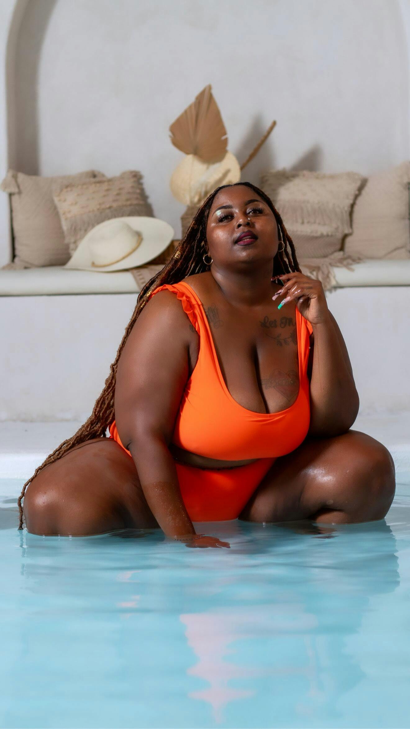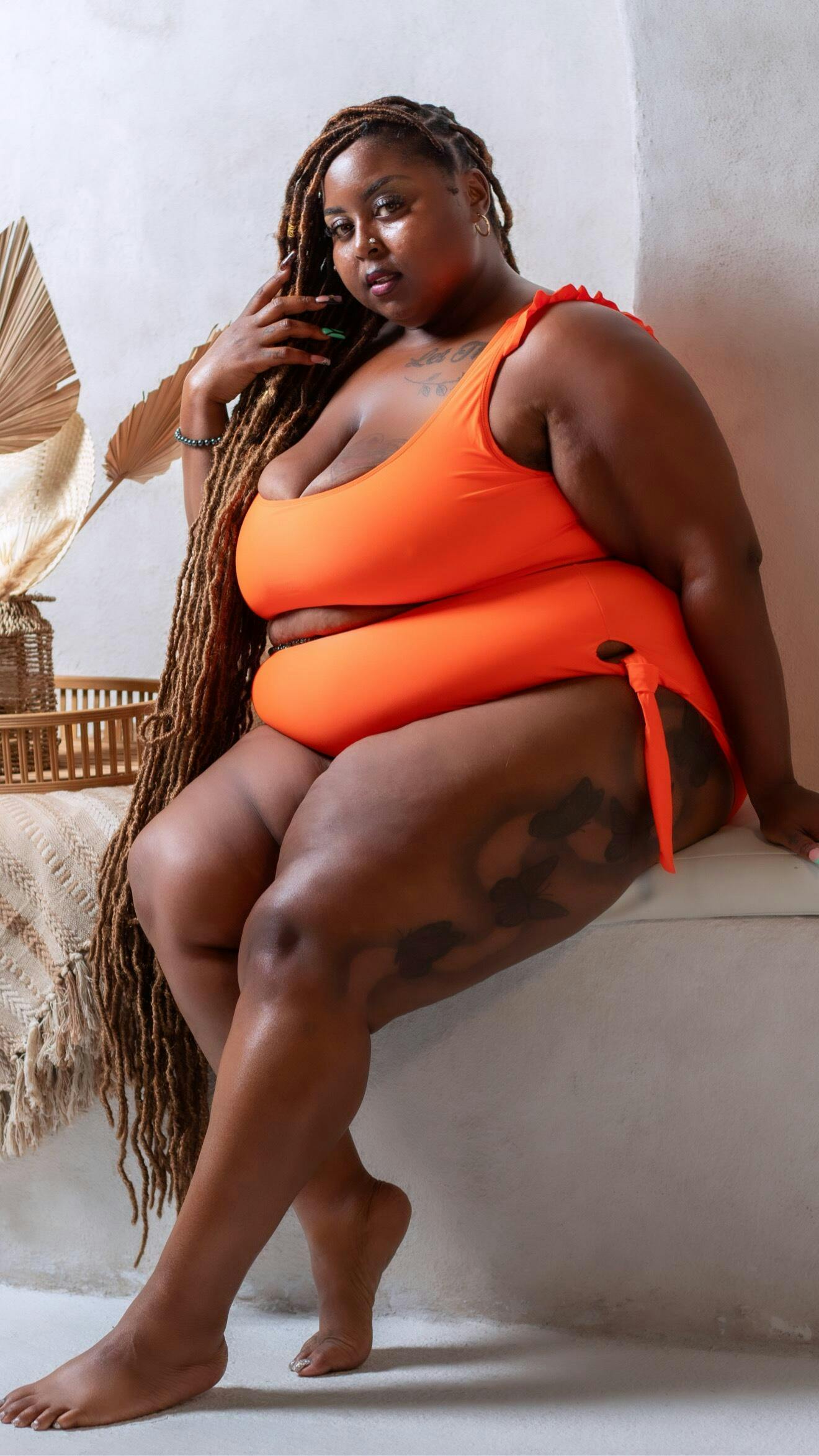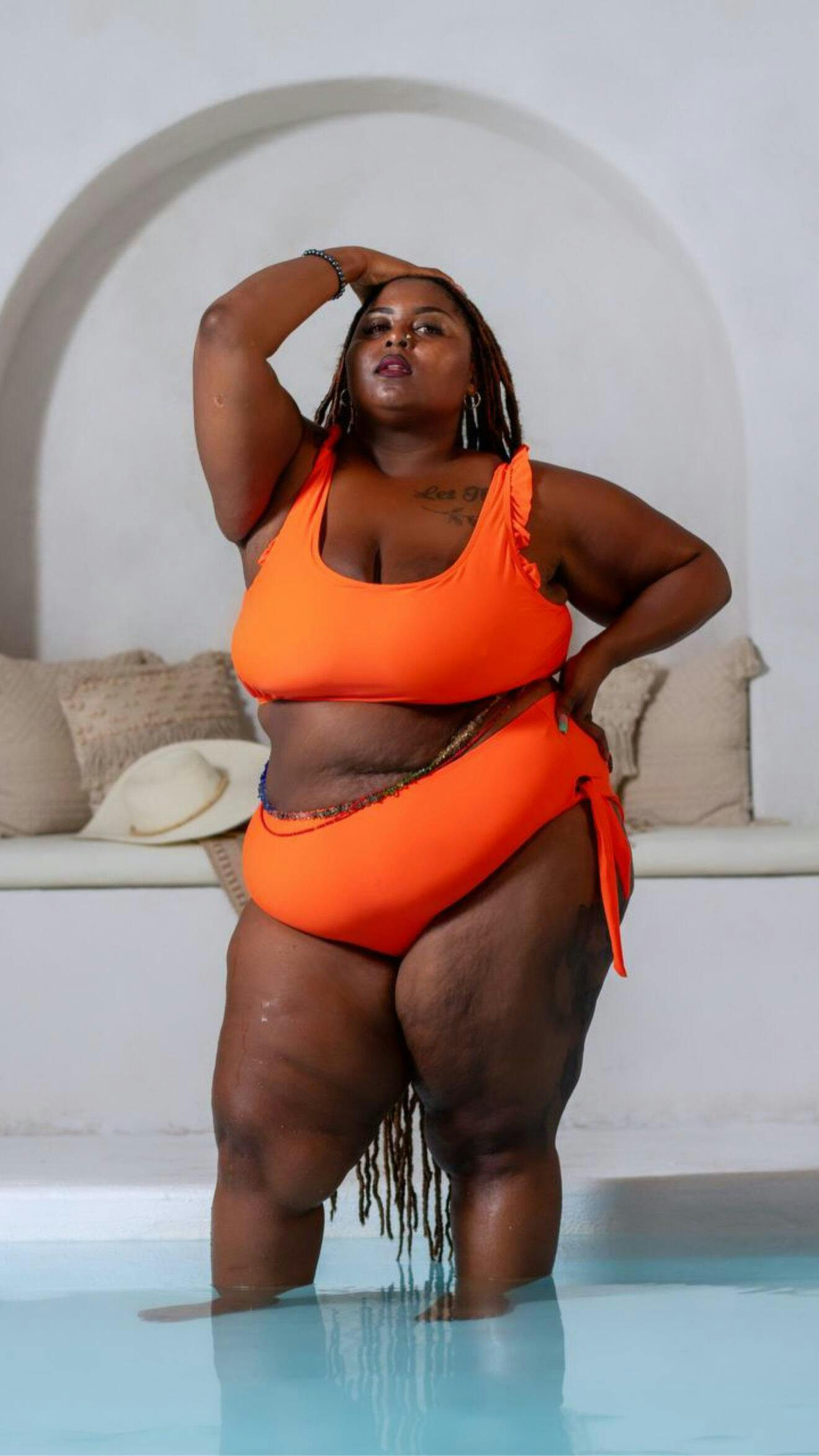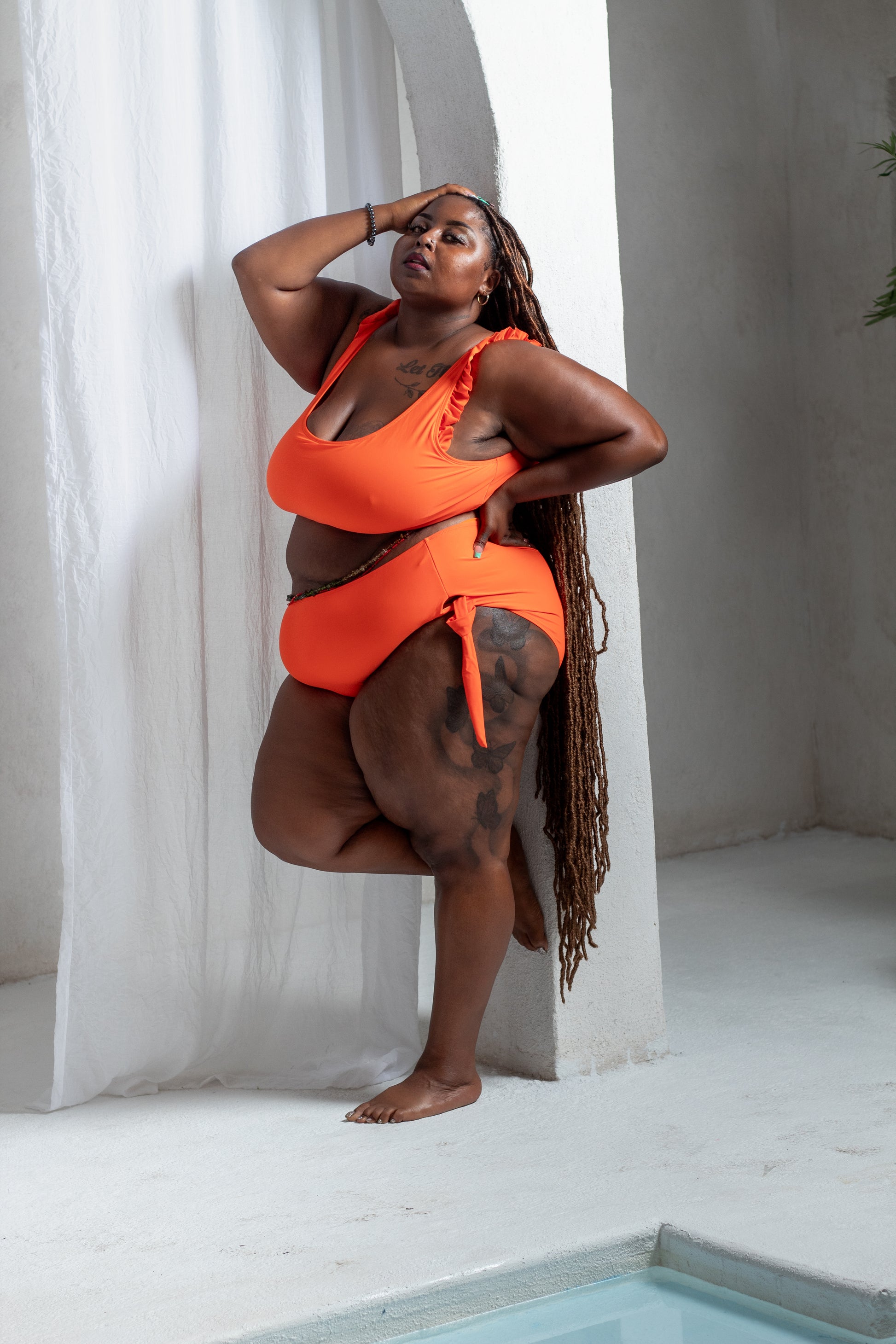 The “ Orange Ruffled Trim Knotted High Waist” Bikini Set is vibrant and fun! The ruffle details add a playful touch, while the knotted front and high-waisted bottoms create a flattering silhouette. The fabric is comfortable and stays in place, making it perfect for both lounging and swimming. Overall, it’s a stylish and cheerful choice for any beach day! 🧡