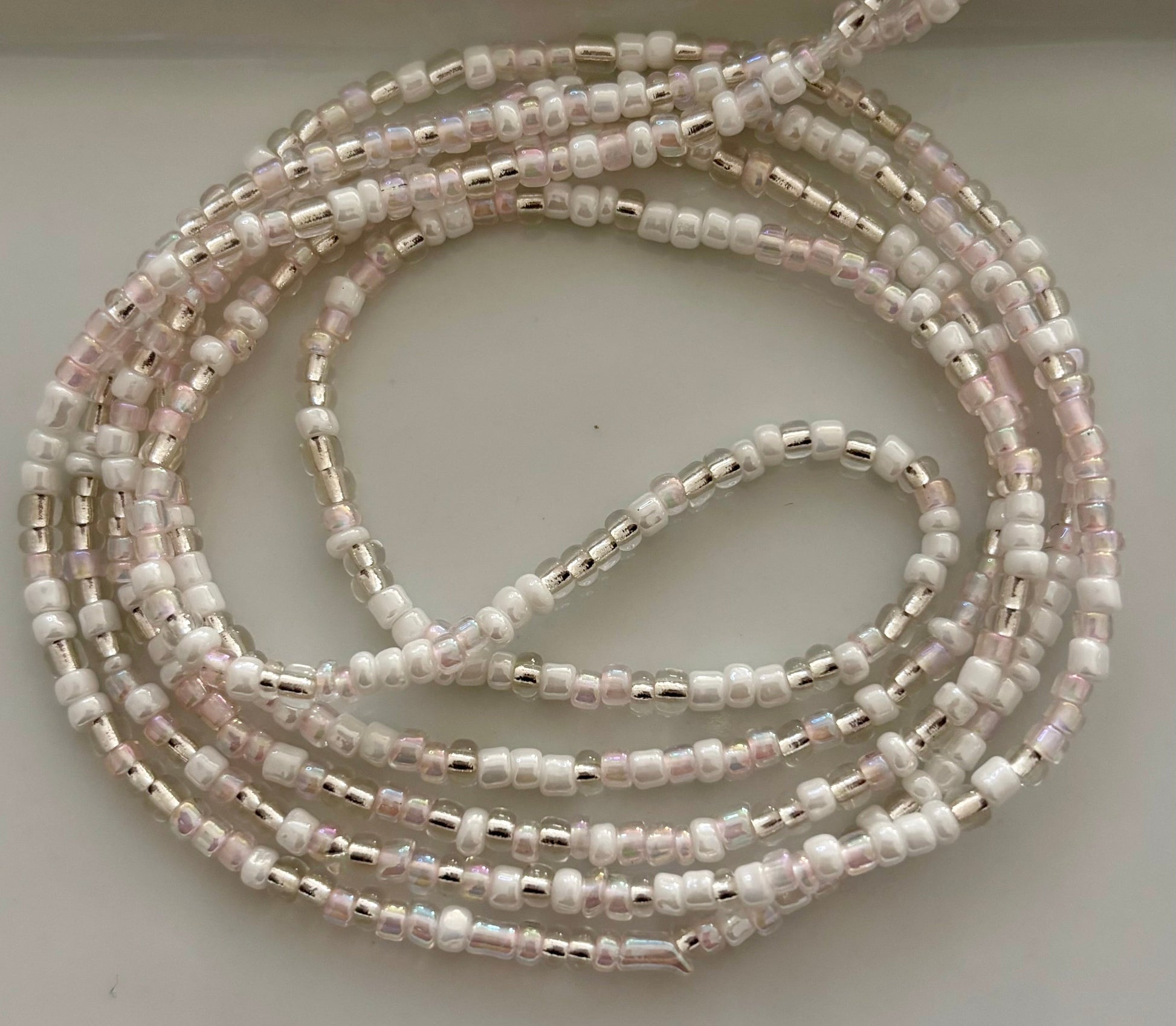 Adorn yourself with elegance and grace with our Pink, White & Silver Princess Waist Beads. This delicate strand blends soft pink tones with shimmering white and radiant silver beads, creating a look that’s both feminine and regal.