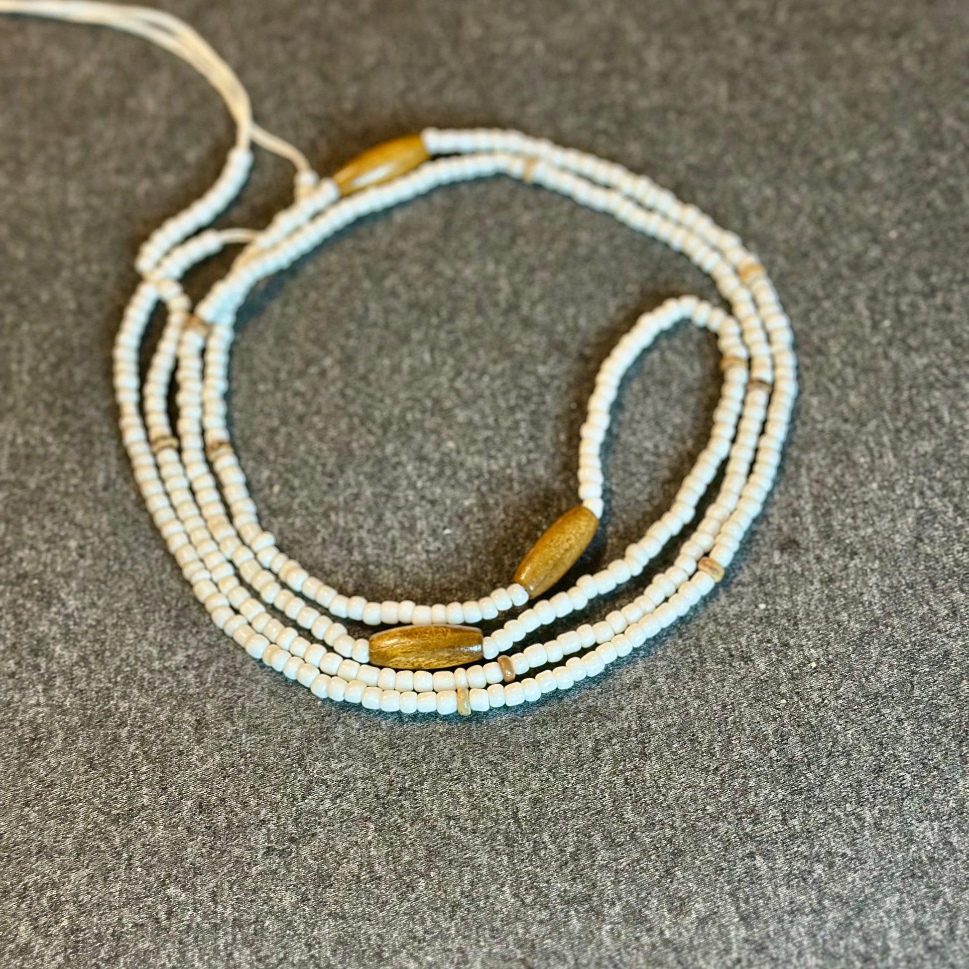 White and wooden traditional tie on waistbeads. Fits up to 48 inch waist.