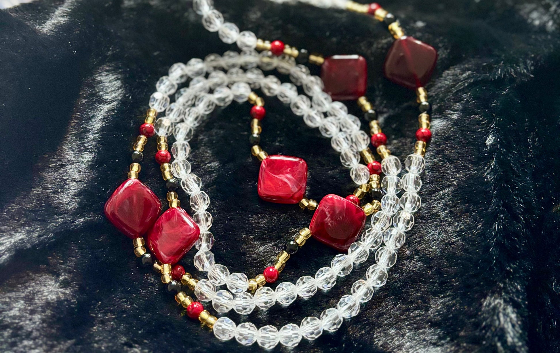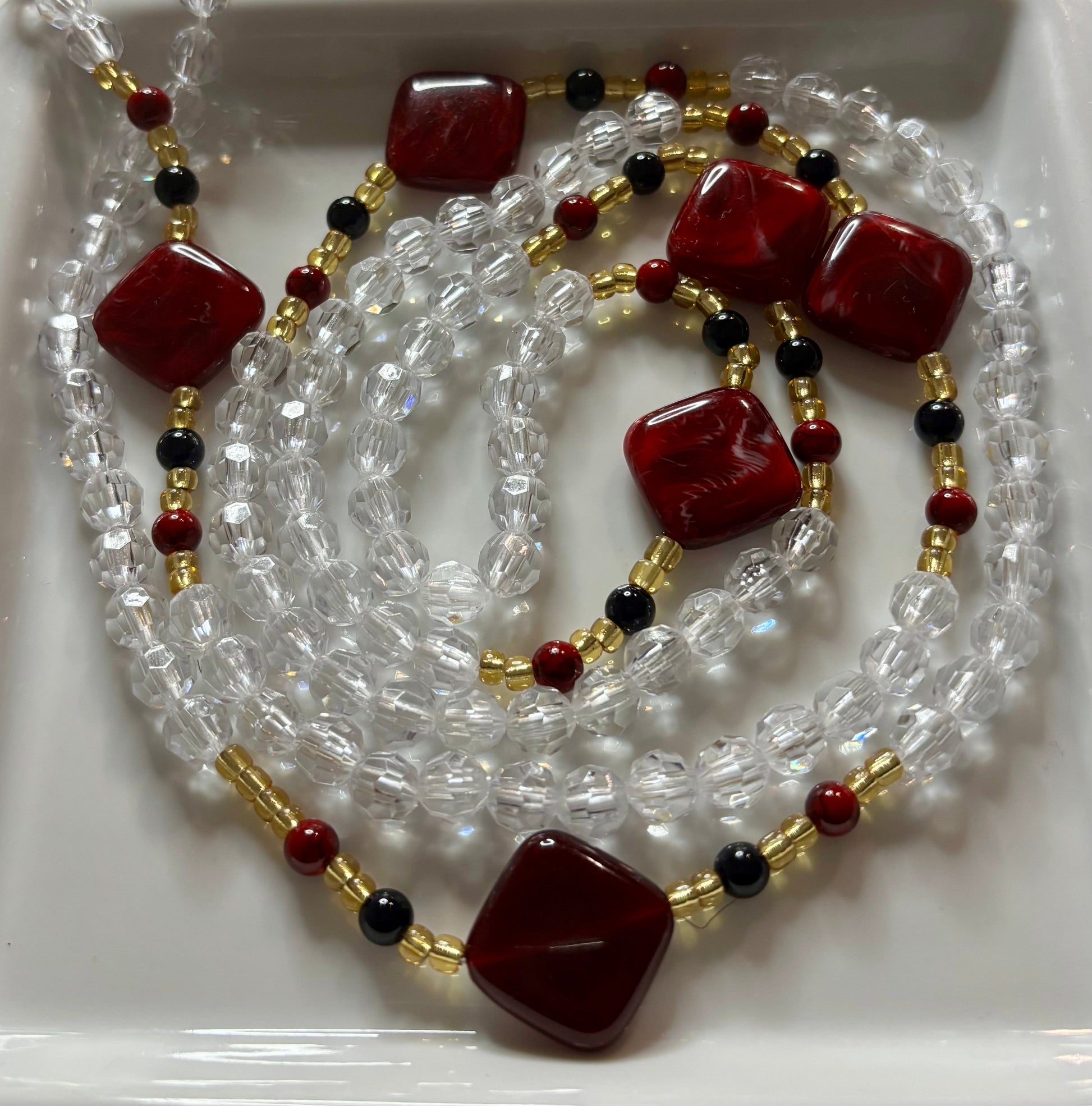 The Queen of Hearts waistbead is a striking blend of elegance and power. Featuring bold red square beads symbolizing love, passion, and vitality, paired with clear crystal beads that represent clarity and spiritual balance, this piece radiates strength and beauty. The gold accents add a touch of royalty, while the black beads ground the energy, bringing protection and stability. Perfect for embracing your inner queen, this waistbead celebrates confidence, femininity, and the magnetic force of love.