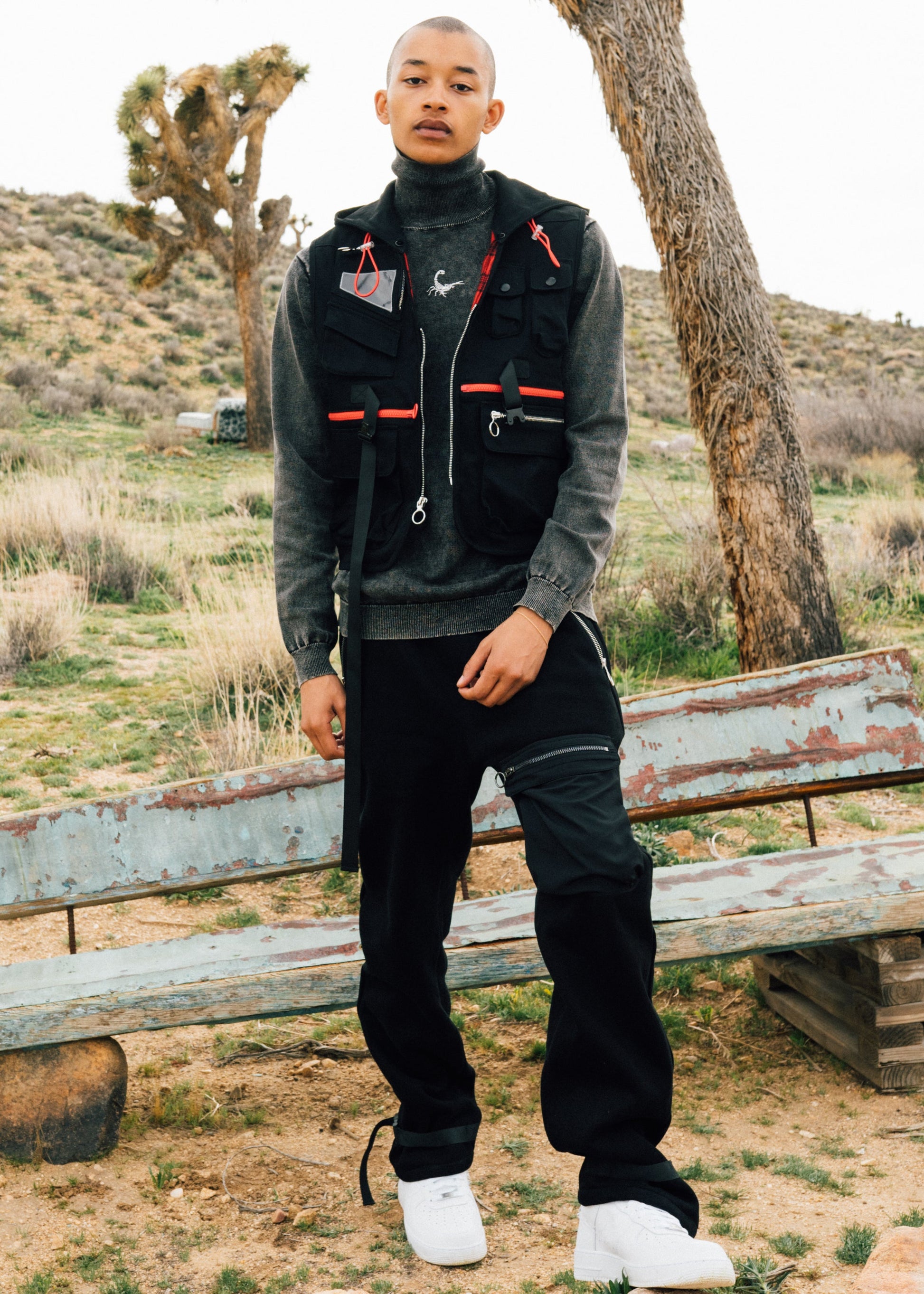 Tactical vest with detachable hood comes with multiple pockets and red zipper accent at waist. Also features nylon tape and metal buckle closure on front.