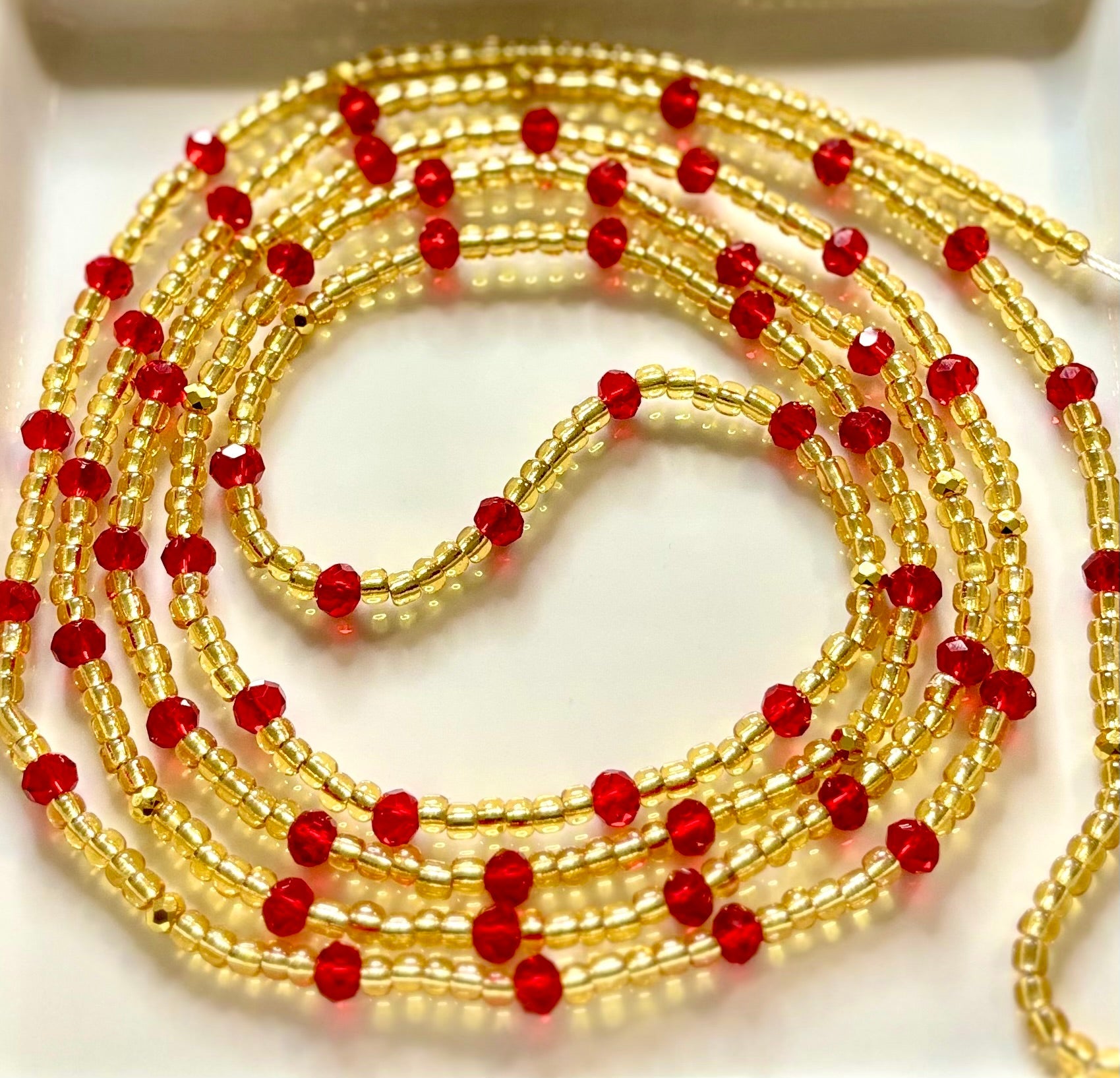 These waistbeads are a luxurious blend of bold and refined, featuring a stunning combination of gold and red crystal beads. The rich, fiery red crystals glimmer with every movement, while the radiant gold beads add an elegant touch of warmth and sophistication. Each bead is carefully chosen and strung together, creating a vibrant, eye-catching pattern that enhances the natural beauty of the wearer. Perfect for adding a touch of glamour to any outfit, these waistbeads are both a statement piece and a timeless accessory, exuding confidence, power, and grace.