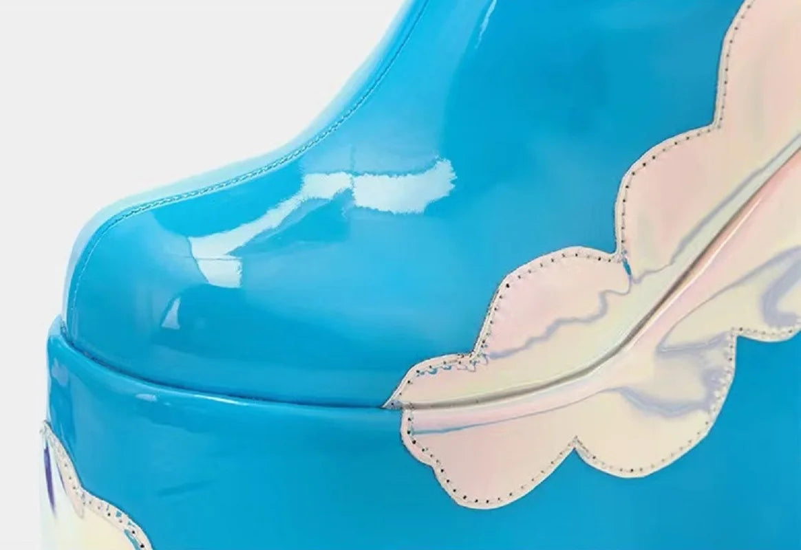 Introducing our new Rainbow Clouds Platform Boots! With a funky rainbow design, these boots will add a pop of color to any outfit. Available in both blue and black options. Step up your shoe game with these unique and playful boots!