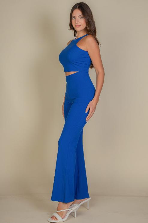 Elevate your casual wardrobe with this stylish ribbed cropped top and bootcut pants set. Designed for a flattering fit with a modern edge, this two-piece set is perfect for day-to-night looks, whether you're lounging or stepping out in style.