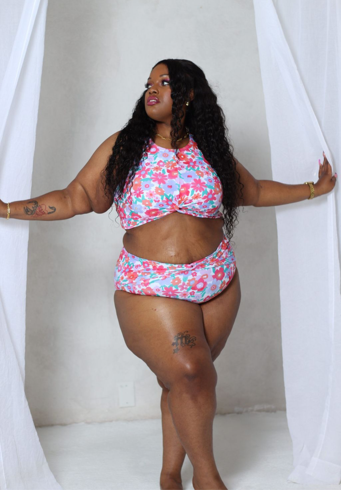 - Stand out in style with this vibrant floral print bikini set designed for plus-size women.