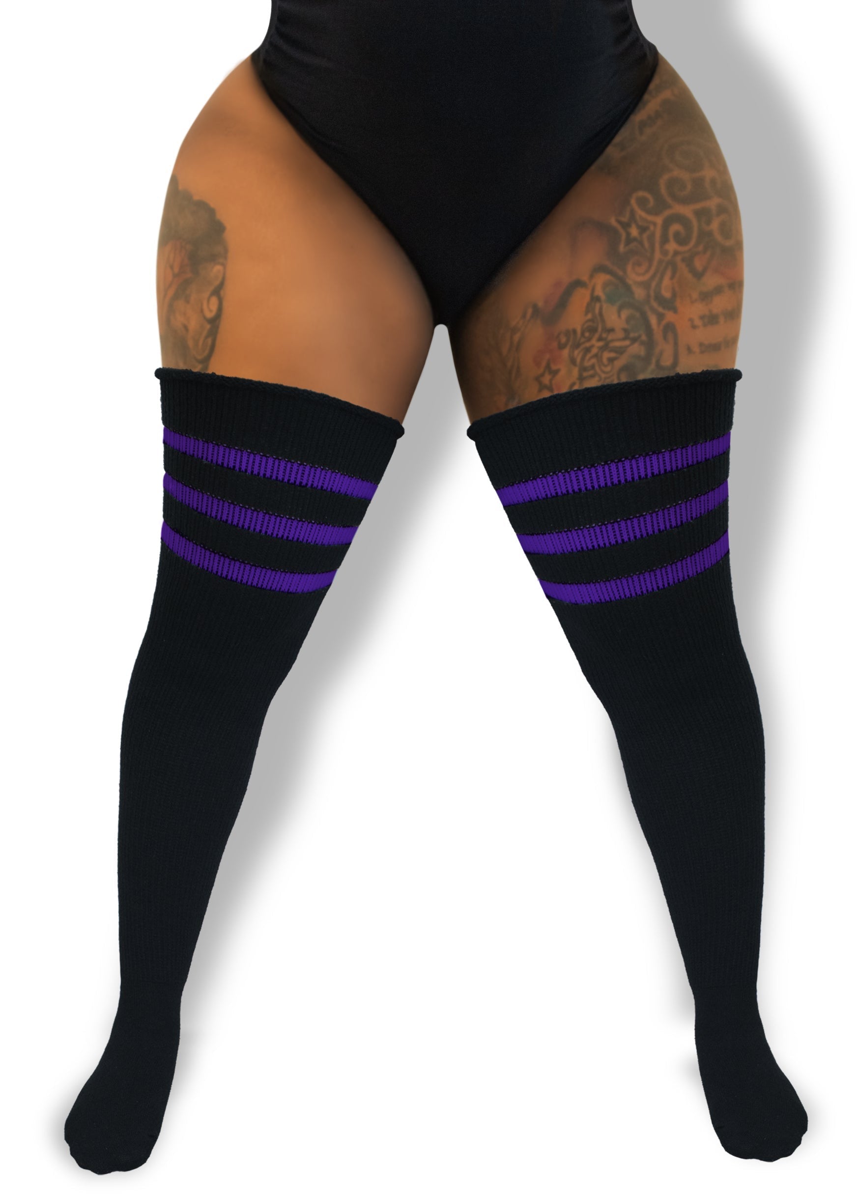 Step up your style game with the Royal Midnight Striped Thigh High Socks, designed to bring a bold, fashionable flair to your wardrobe. These sleek black thigh-high socks are accented with deep purple stripes, offering a sophisticated yet edgy vibe. Whether you're looking to make a statement or simply want to keep warm in style, these thigh-highs are made to fit and flatter plus-size thighs, ensuring a comfortable and secure fit that stays in place all day.