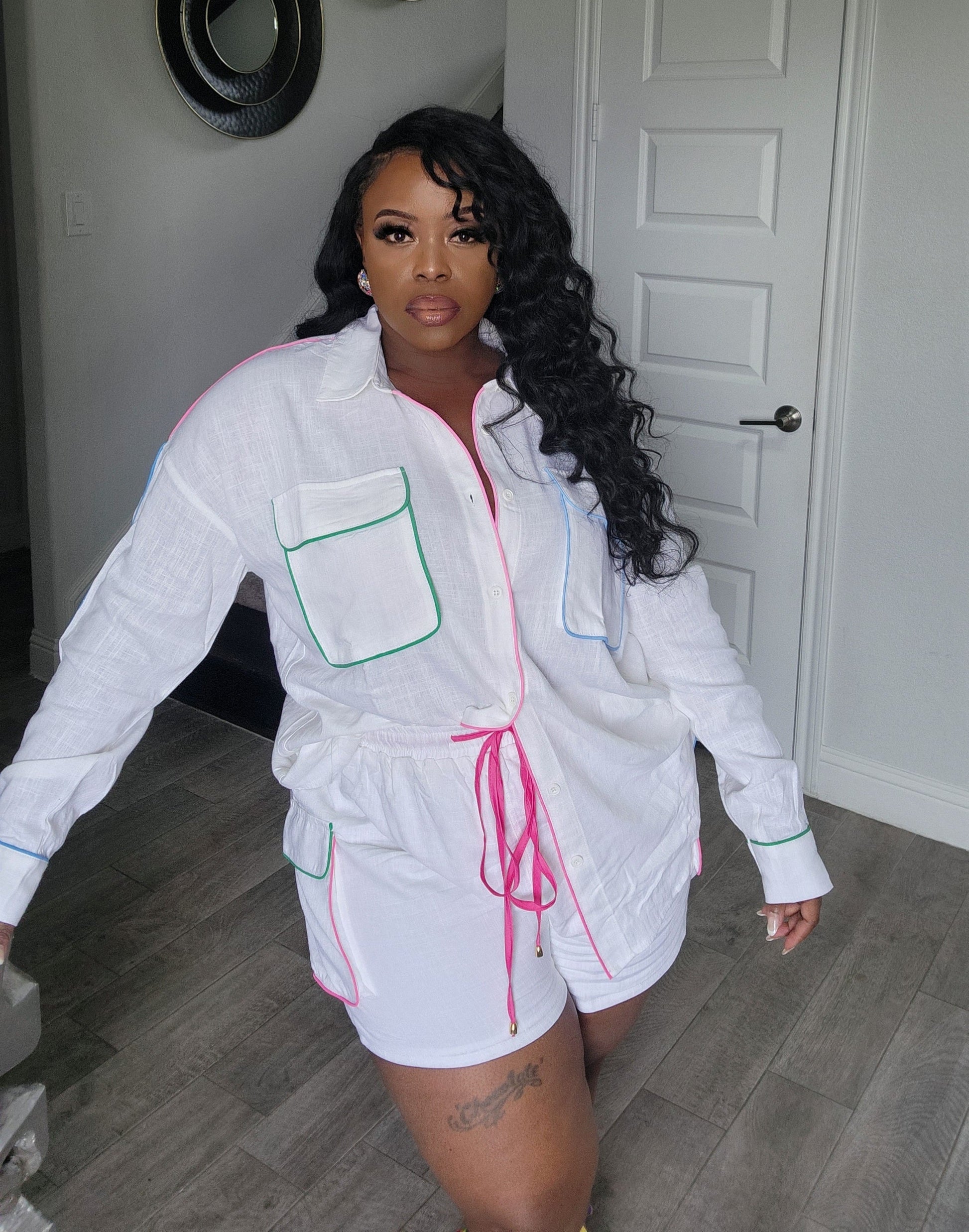 White w/multicolor trim. Non-stretch short set. Collar, Long sleeve, Pockets, High-waisted shorts, Elastic waistband. Hand wash cold
