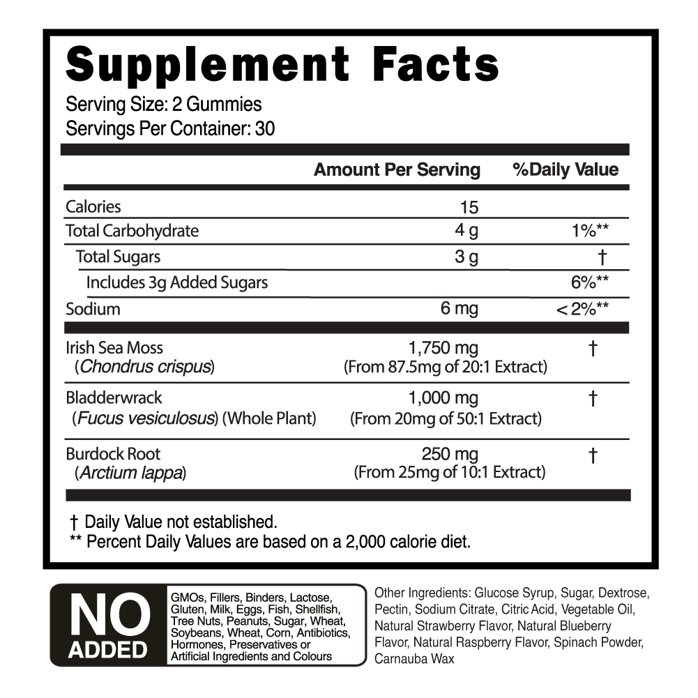 We have proudly recreated our best-selling formula into Irish Sea Moss gummies that pack all of the powerful health benefits with none of the fuss. Get the same potency and the same health kick from the cleanest wildcrafted herbs, in one handy and delicious sweet treat.