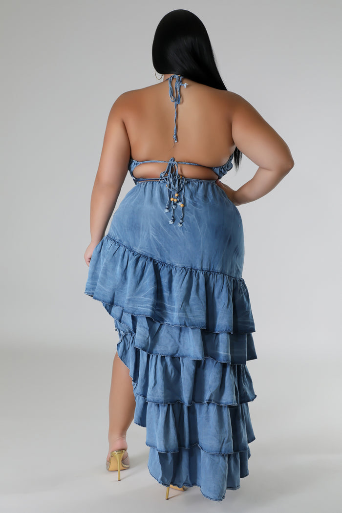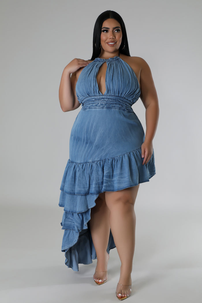 Experience the ultimate in confidence and renewal with our SHIMMY COCO Denim Ruffle Dress. This flirty halter top dress features a high low side ruffle split that will have all eyes on you. Get ready to feel alive and alluring as you shine in this must-have dress. Don't miss out!"