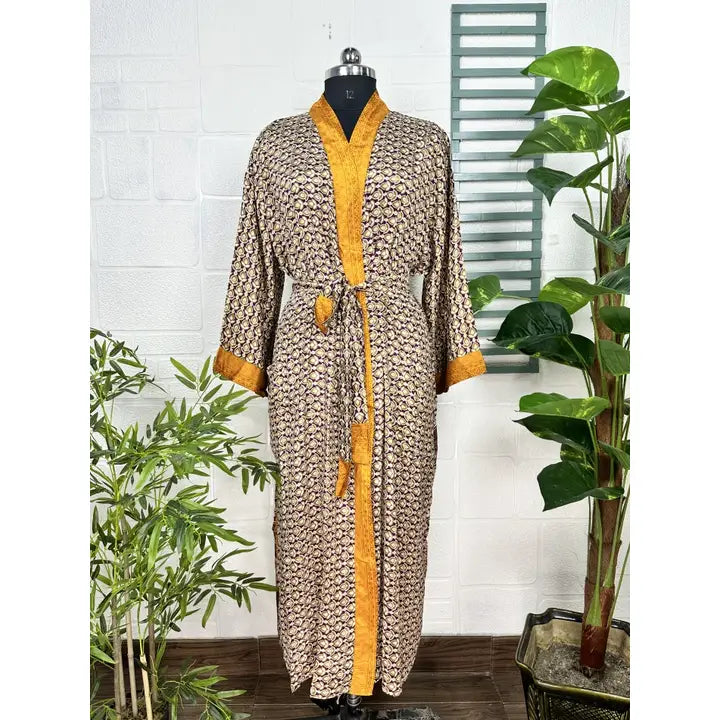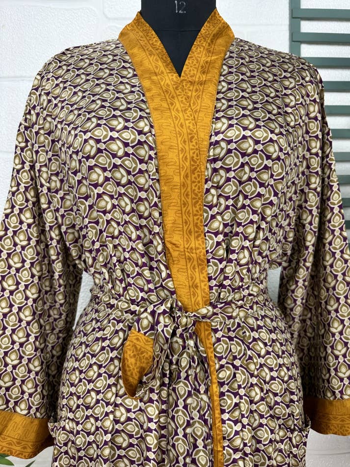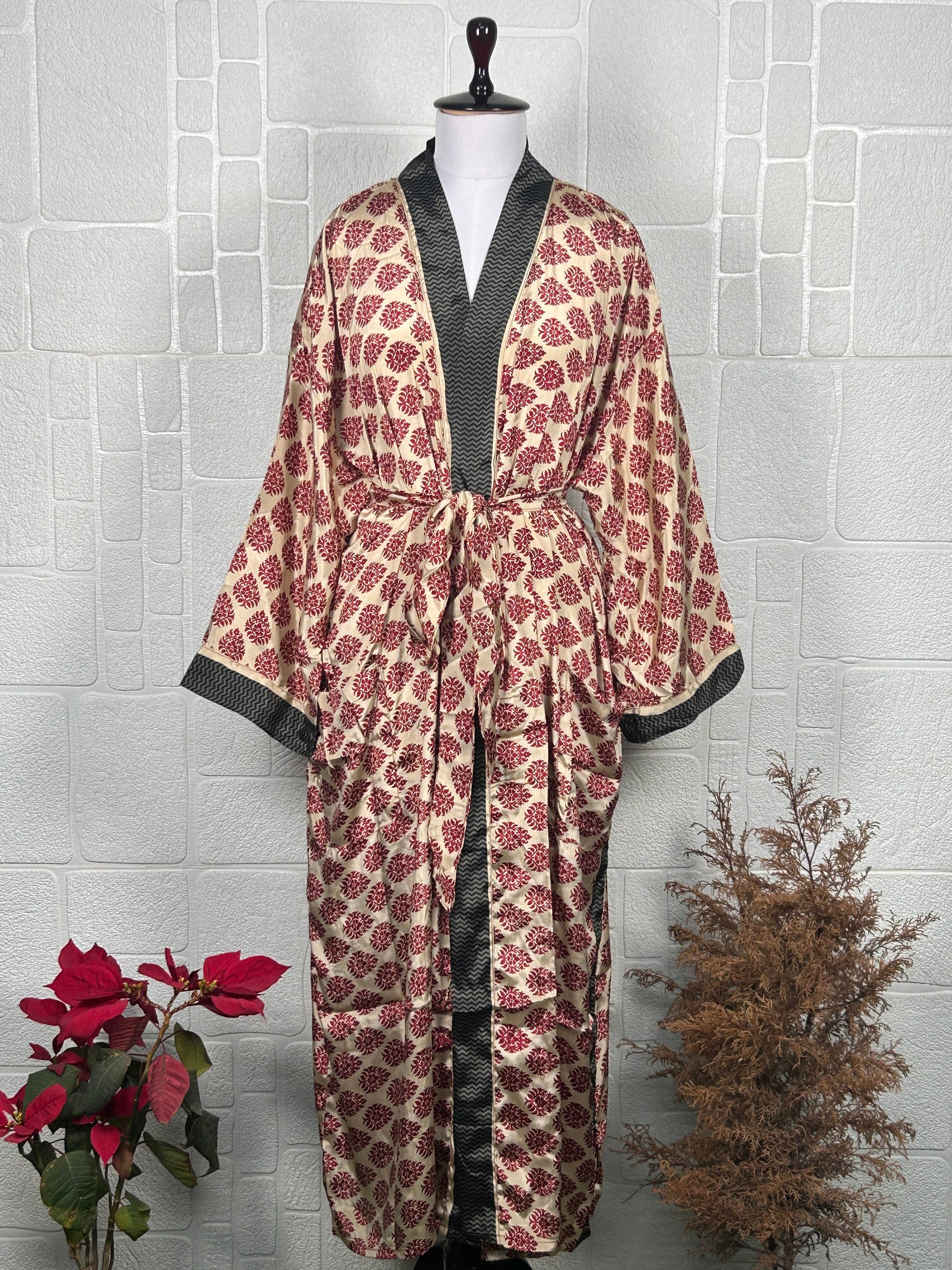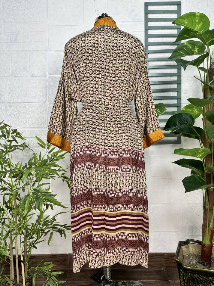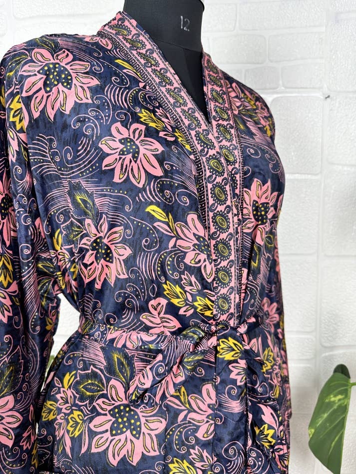 This beautiful robe is crafted by hand and is made from high-quality new silk sari’s. Almost weightless, stylish, and very urban that creates a flowing motion with every movement. Perfect for lounging. Very luxurious to touch :) A heavenly touch for cozy evenings in: this luxurious robe is crafted with love and care, creating an elegant effect with each step. Slip in and experience bliss! Let the night take you away.