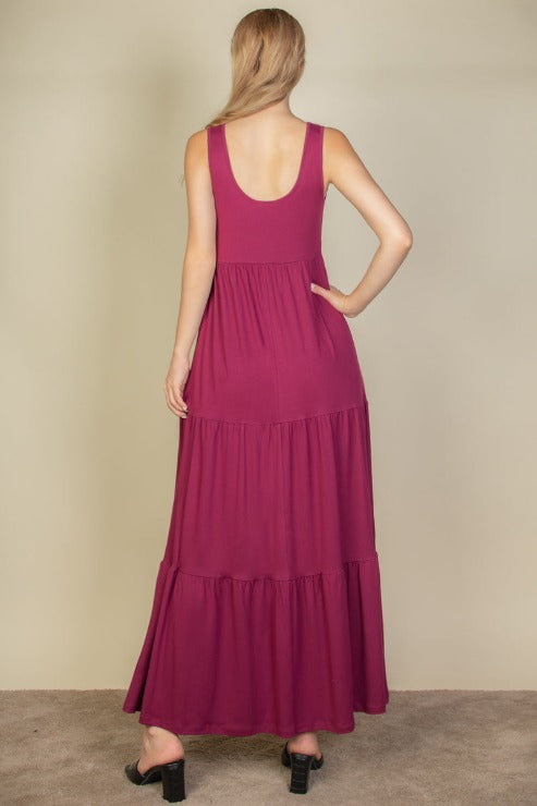 Designed for effortless elegance, this tiered maxi dress is a versatile staple for any wardrobe. The scoop neckline and sleeveless silhouette provide a flattering fit, while the layered hem adds a graceful flow to every step. The soft, lightweight fabric ensures breathable comfort, making it perfect for warm-weather outings or layering in cooler seasons. Whether styled with sandals for a casual day look or dressed up with accessories for an evening ensemble, this dress delivers a timeless appeal.