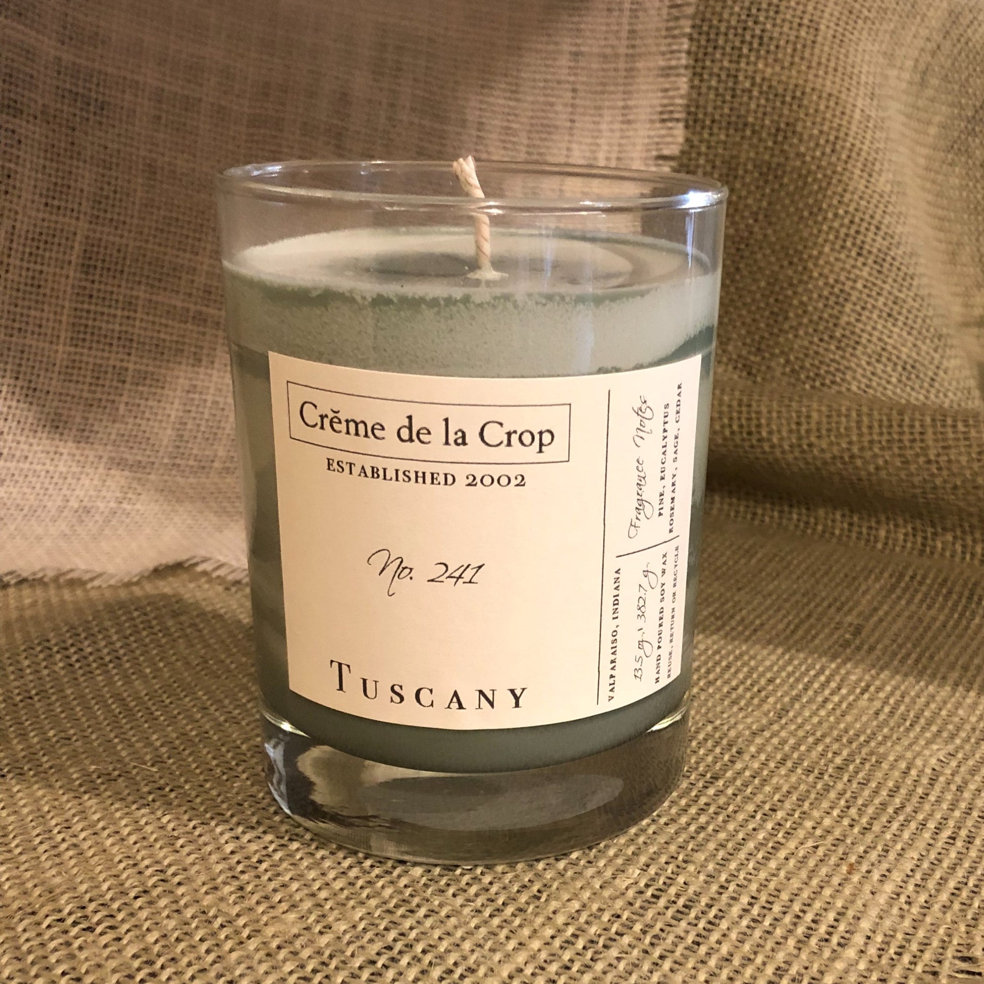 Our Tuscany candle has strong notes of Rosemary & Sage, giving this candle an herbal and aromatic quality. Cooling Eucalyptus and Pine notes lift up the fresh green floral scent while the Sage and Cedar give the candle a woodsy base.