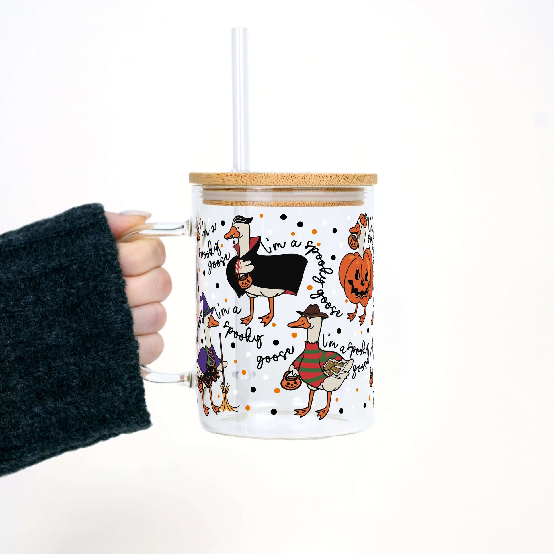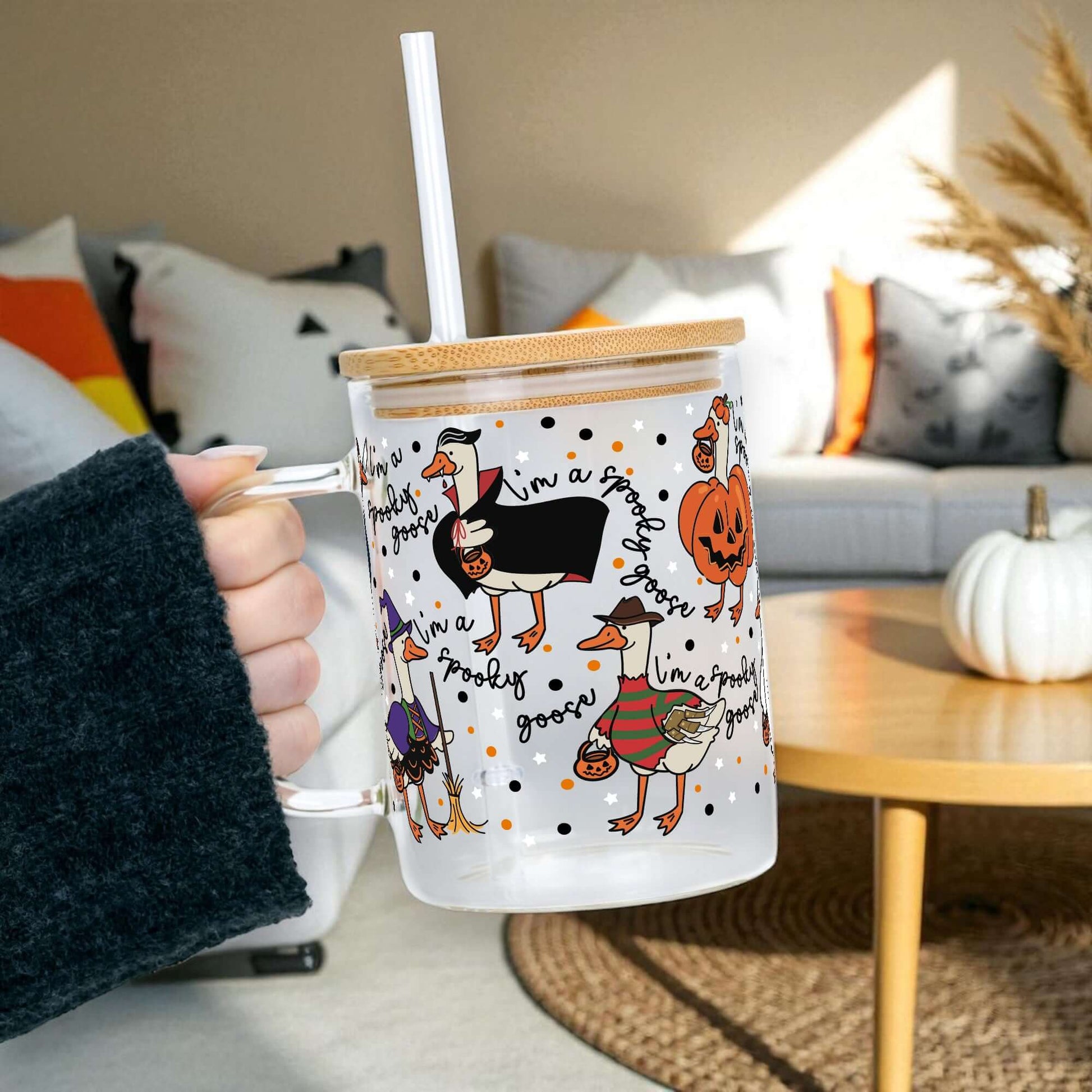 Spooky Goose 17oz Glass Mug With Lid and Straw