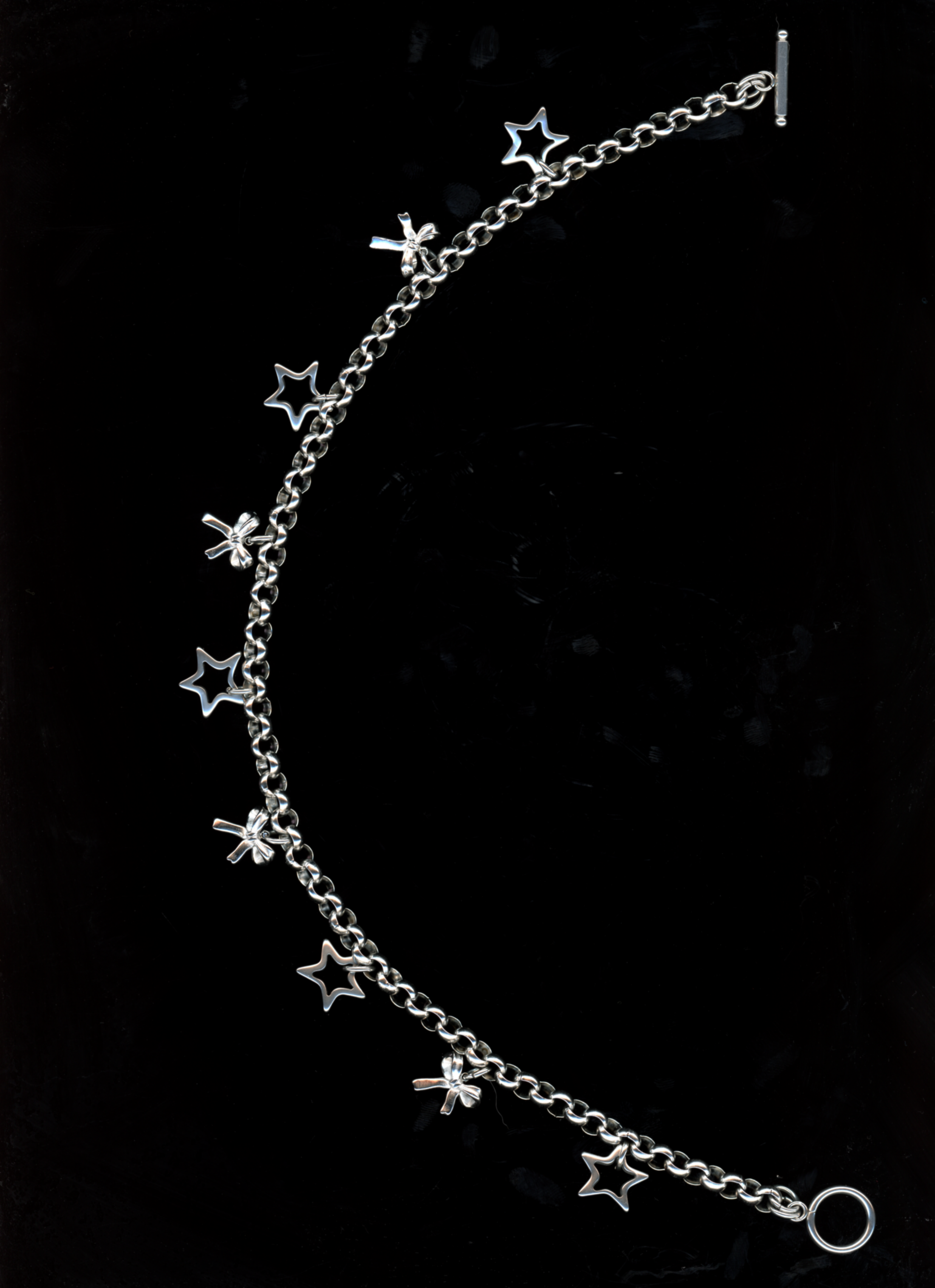 The Farrah Charm Necklace features hollow star & 3d bow charms, elegantly adorning a chunky rolo chain. Crafted from high-quality 304 stainless steel, this eclectic piece is designed to shine while offering lasting durability. Finished with a classic toggle closure for effortless wear.
