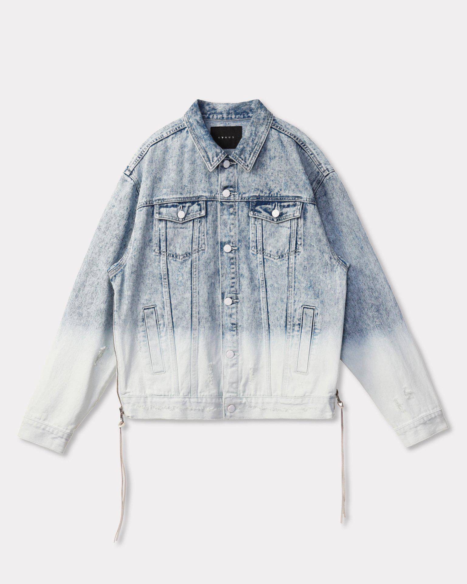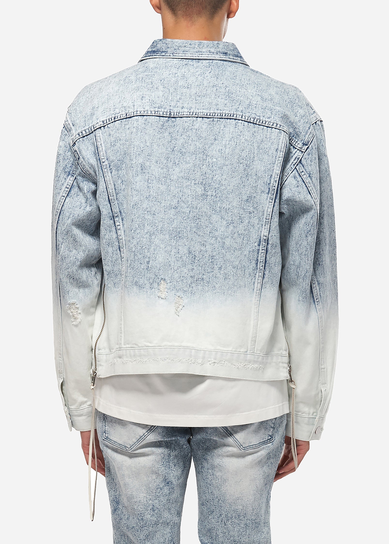 Denim trucker jacket with acid wash throughout with ombre bleaching at the bottom. Also features heavy metal zippers with white leather cords at the side seams.