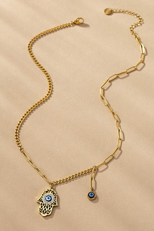asymmetric openwork hamsa hand evil eye pendant necklace with an evil eye chain drop on the side.