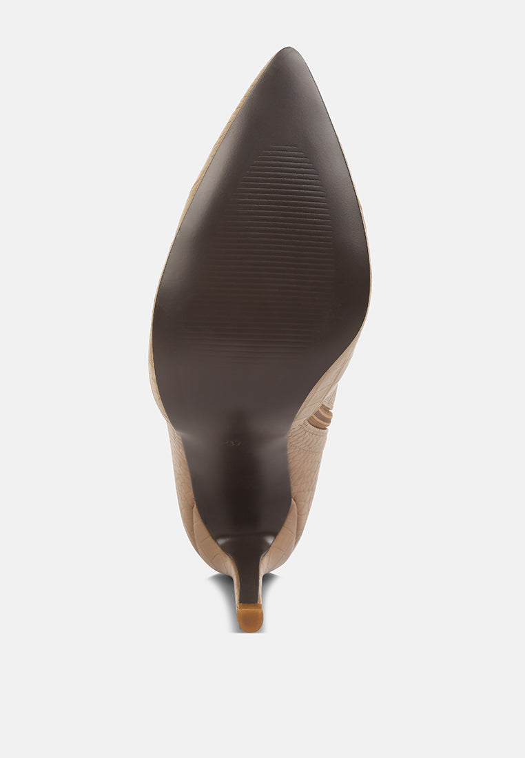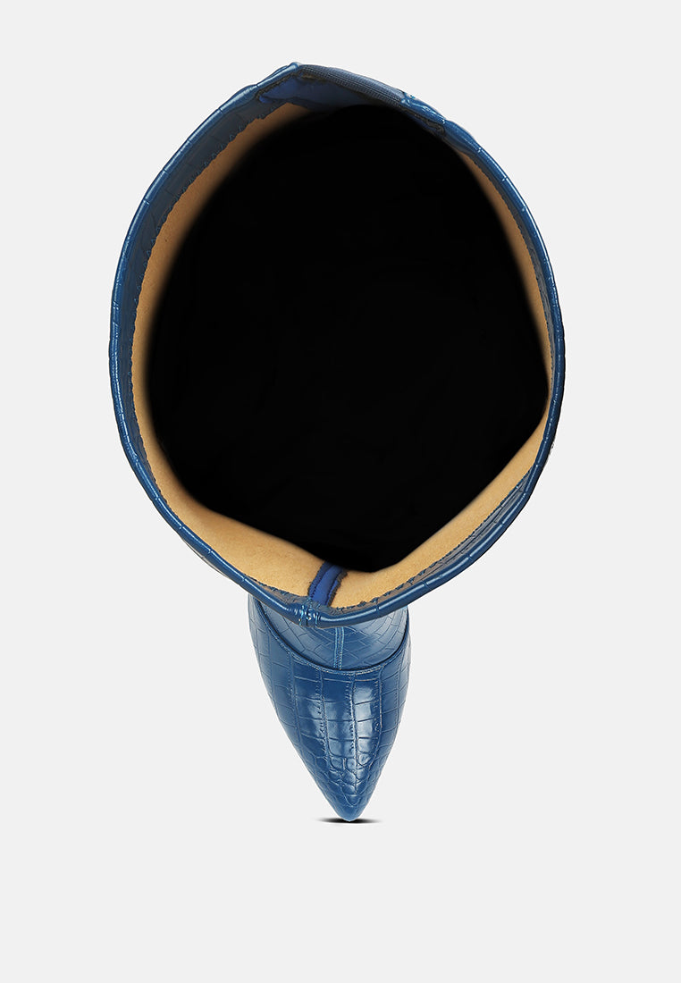 Calf High Boots in croc textured faux leather is a sharp and trendy design. Comes with a side zipper opening. The pointed heel boot with pointed toes will glam up your look with zero effort.