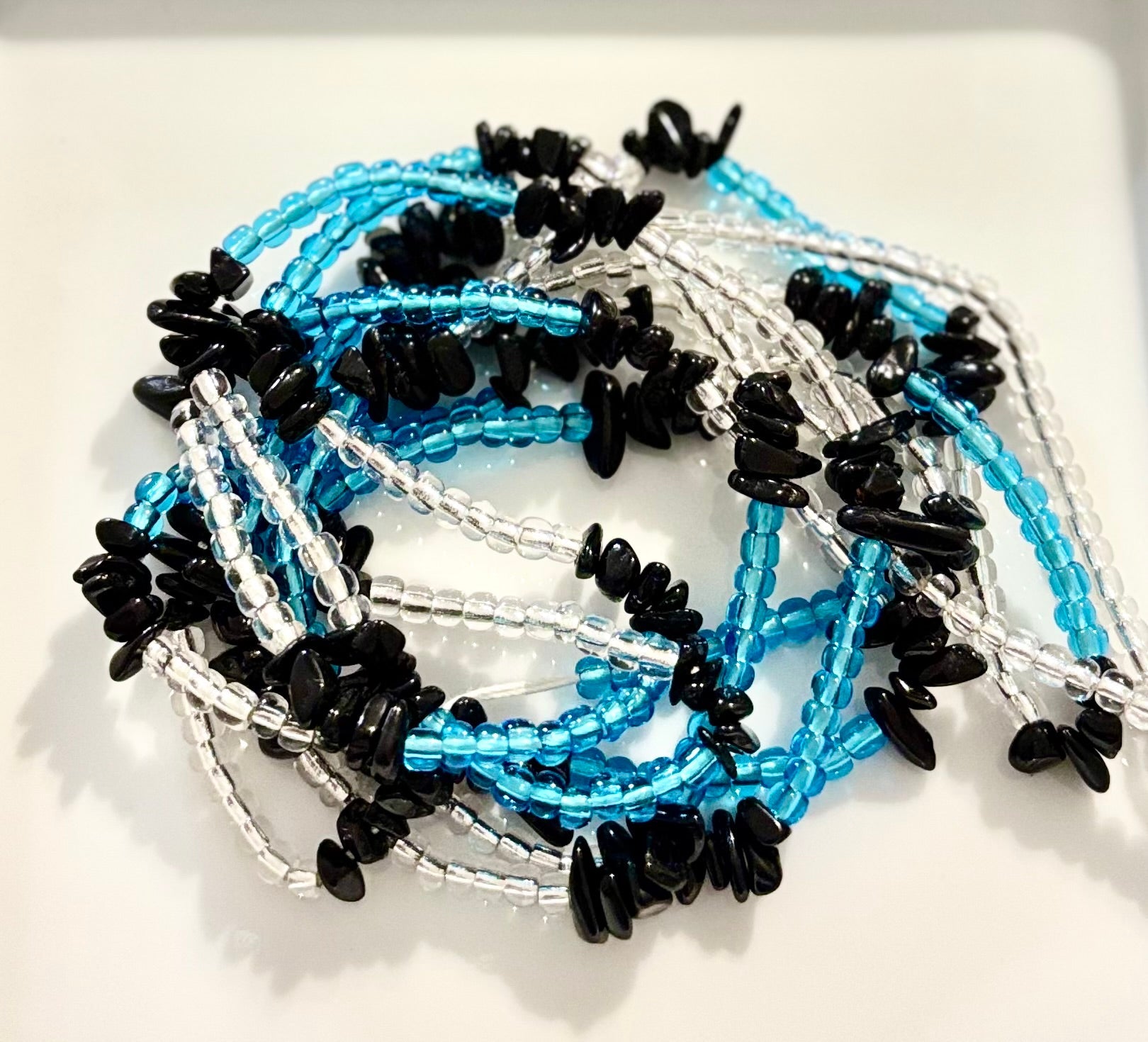 Elegant and protective, these blue and clear waist beads are enhanced with natural black tourmaline chips—known for their grounding and shielding properties.