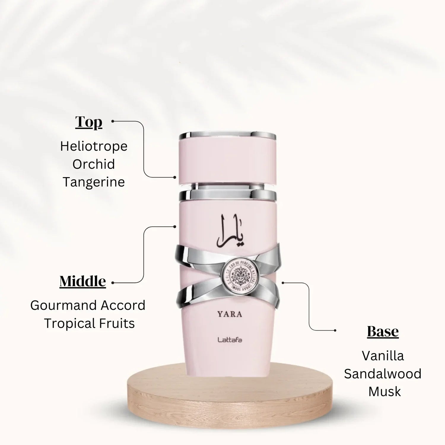 Expertly crafted by Yara, the Lattafa 3.4 oz EDP for women boasts top notes of heliotrope, orchid, and tangerine, followed by a heart of gourmand accord and tropical fruits. The base of vanilla, sandalwood, and musk provide a subtle yet alluring finish. Elevate your scent game with this sensual fragrance.