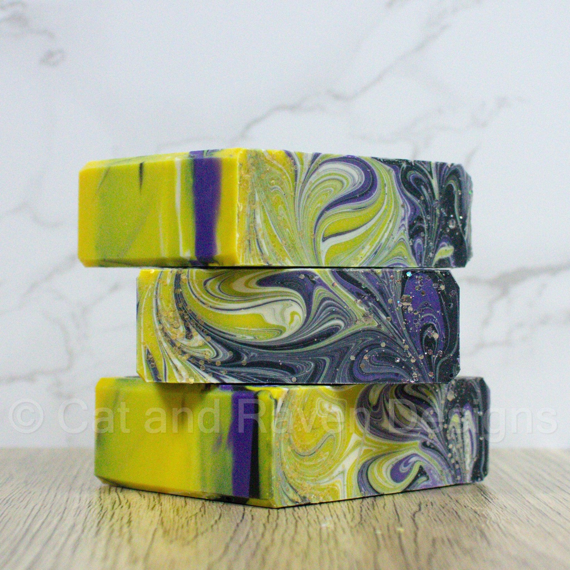 Ingredients: olive oil, rice bran oil, coconut oil, palm oil (RSPO), sodium hydroxide, almond oil, castor oil, sodium lactate, fragrance, micas, and biodegradable glitter.