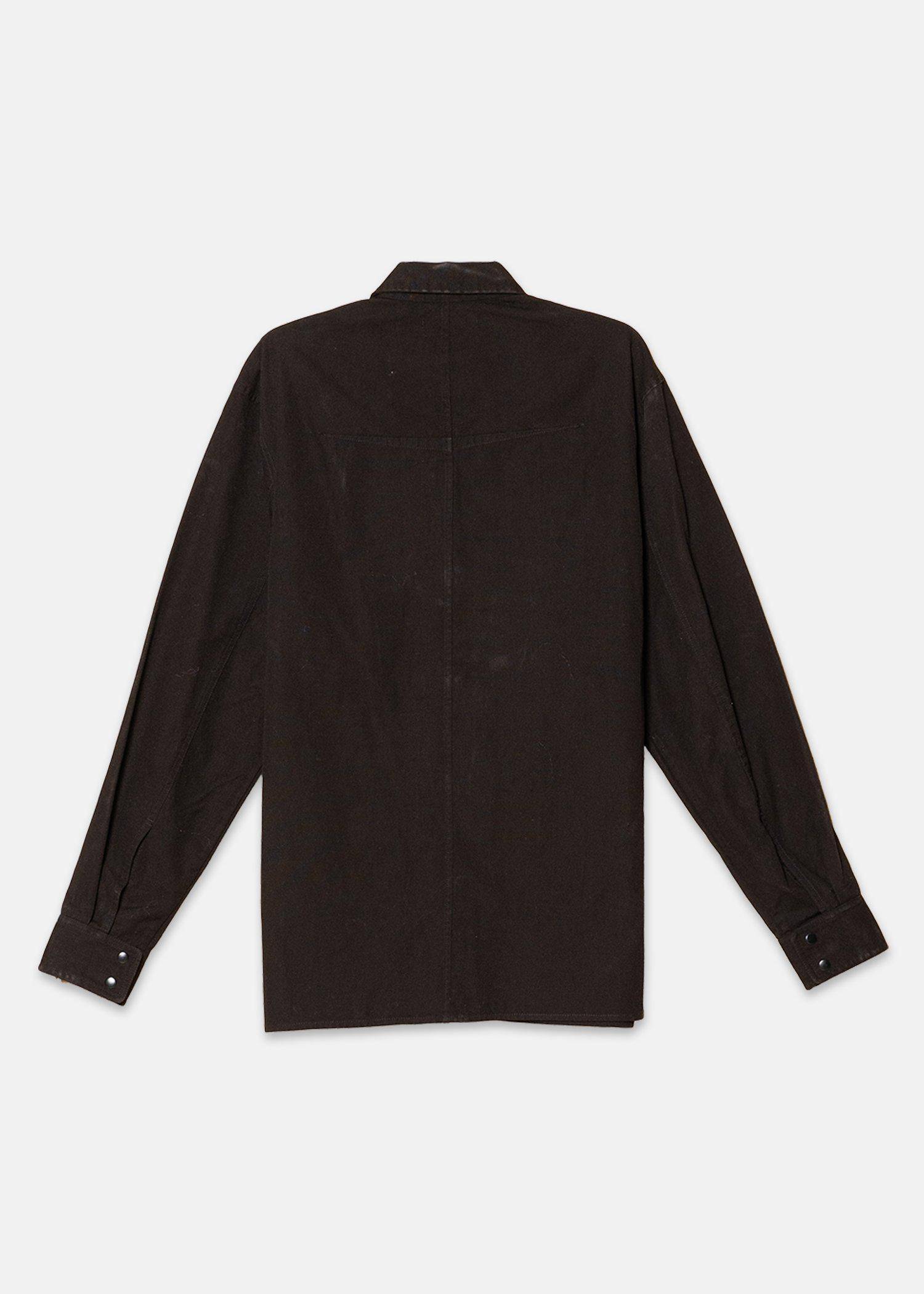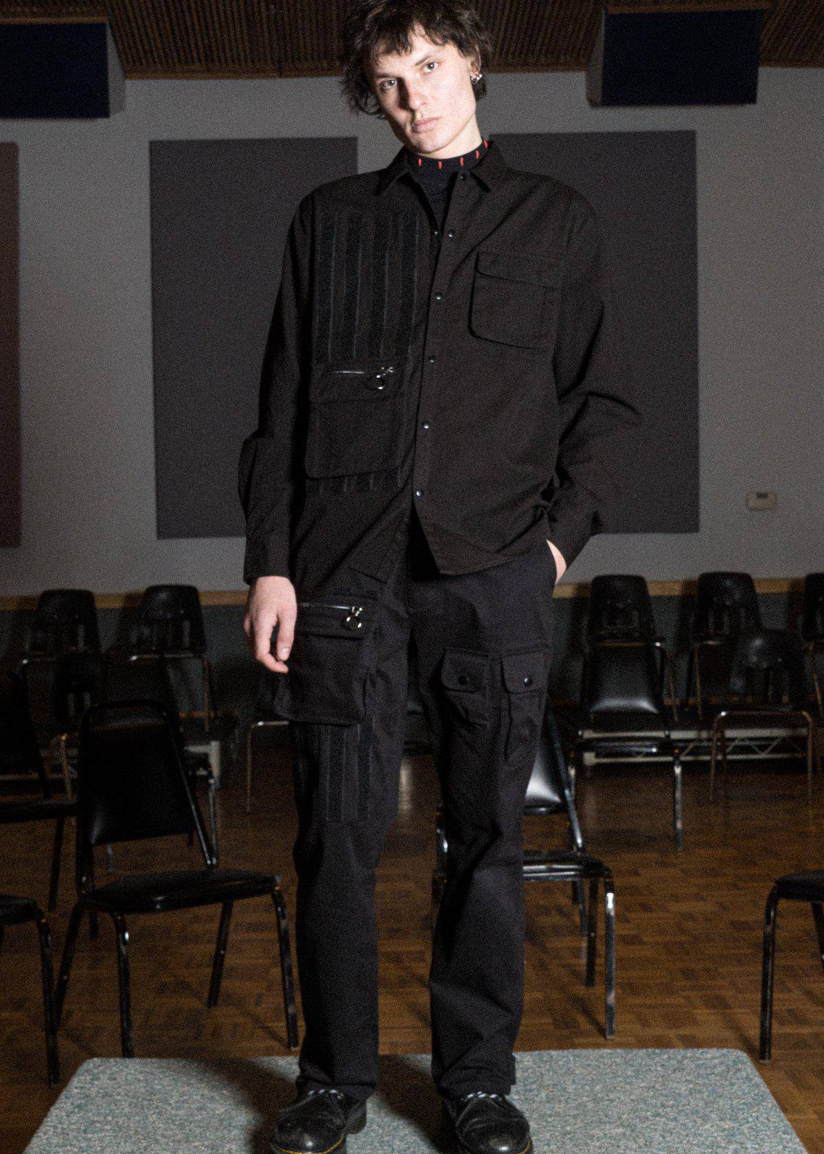 Long sleeve button-up shirt in canvas with bellow chest pocket with flap on the left side and detachable bellow pocket with flap on the right side. The shirt comes with a snap button front closure and cuffs